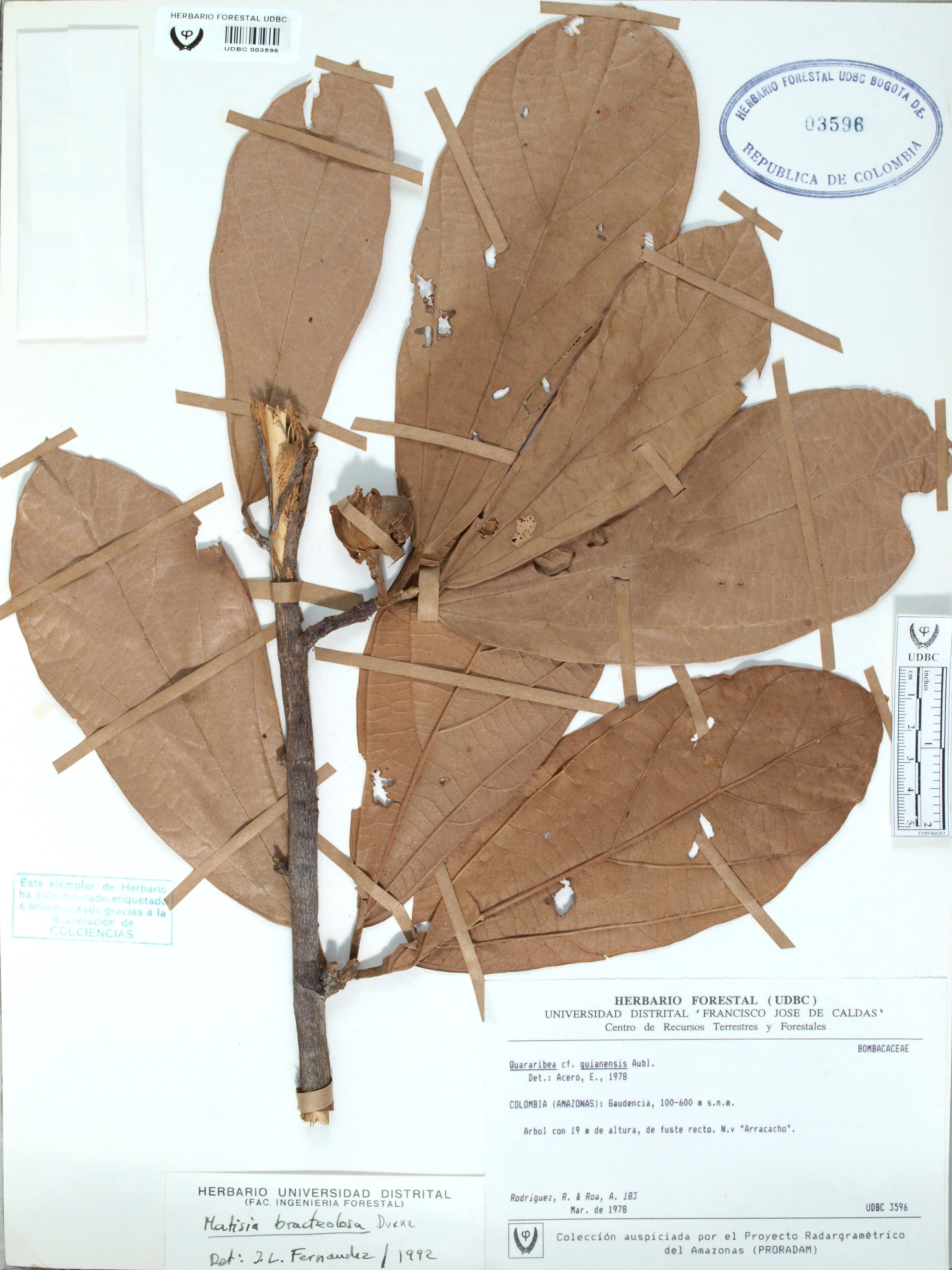 Fotografía del ejemplar Rodríguez, R. 183, determinado como Matisia bracteolosa en el año 1992