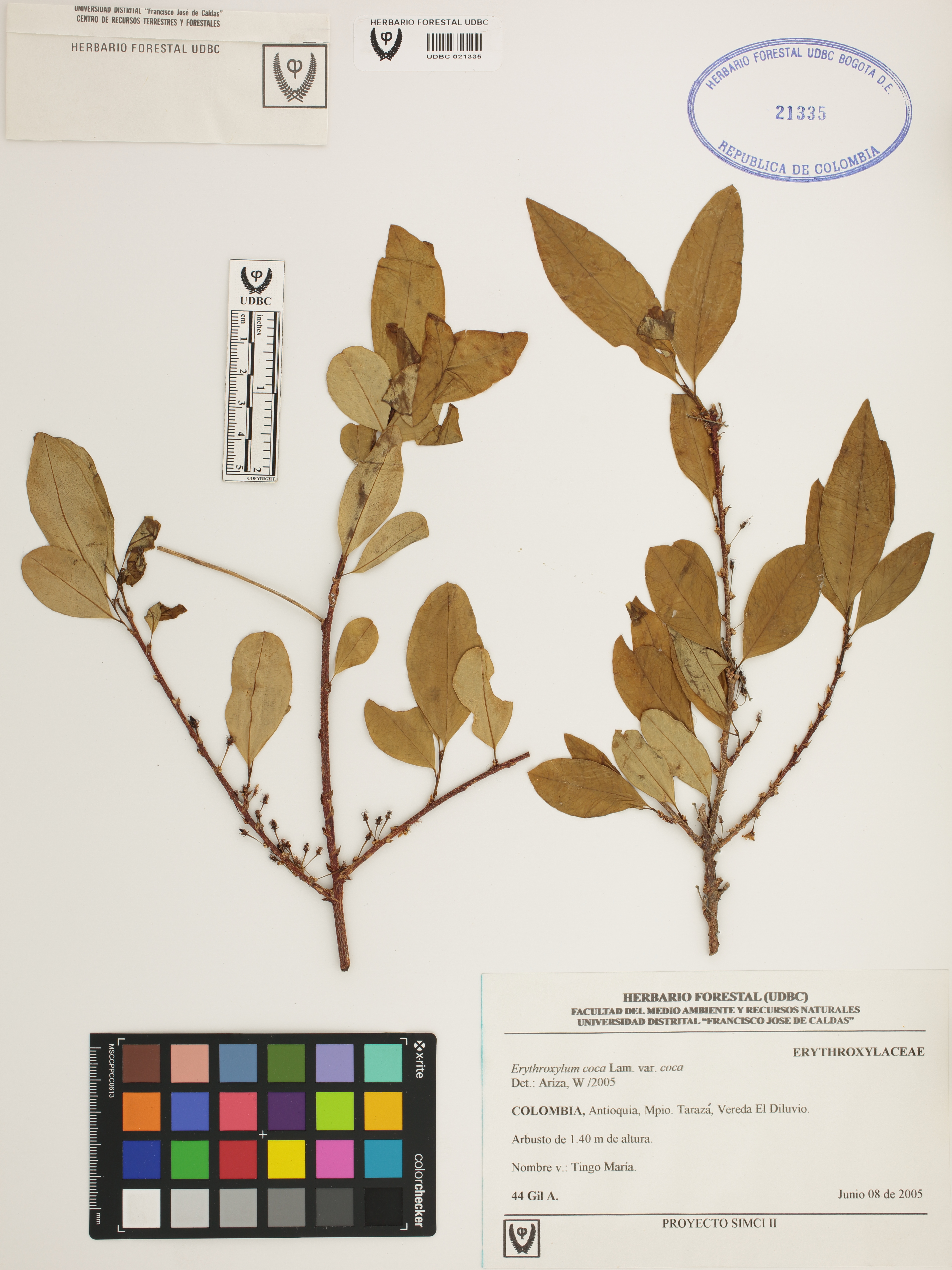 Fotografía del ejemplar Gil, A. 44, determinado como Erythroxylum coca var. coca en el año 2005