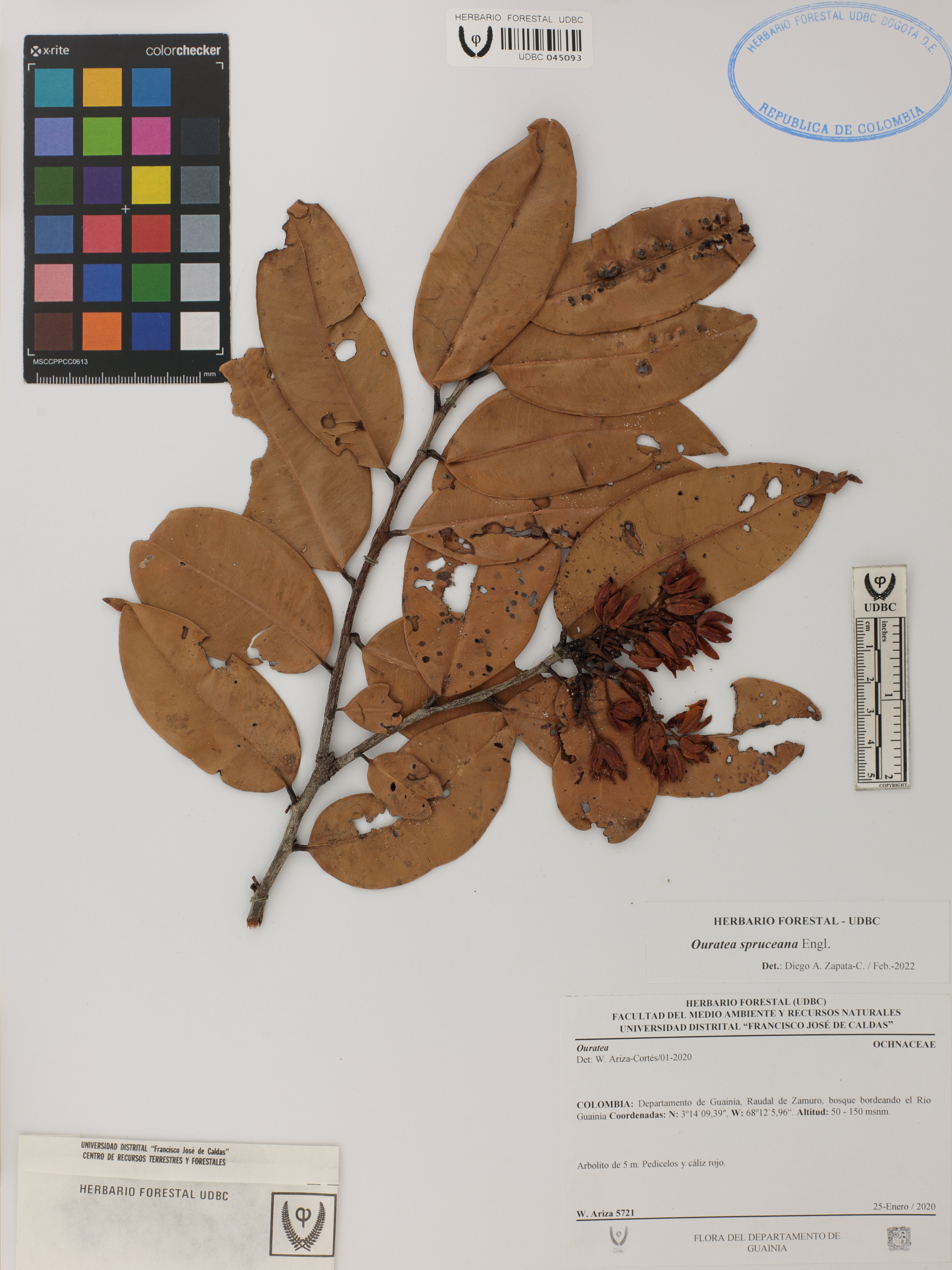 Fotografía del ejemplar Ariza-Cortés, W. 5721, determinado como Ouratea spruceana en el año 2022