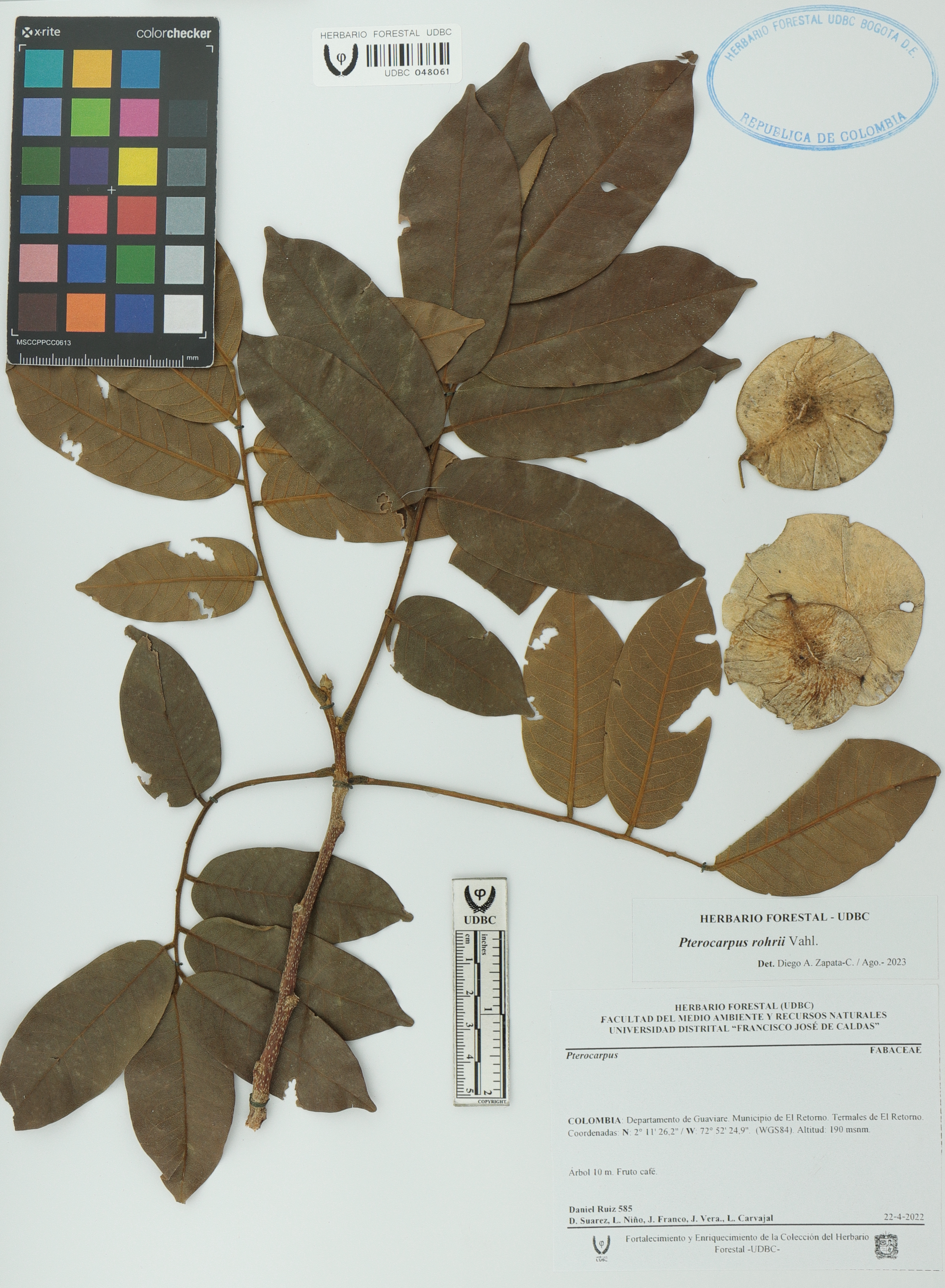 Fotografía del ejemplar Ruiz, Daniel 585, determinado como Pterocarpus rohrii en el año 2023