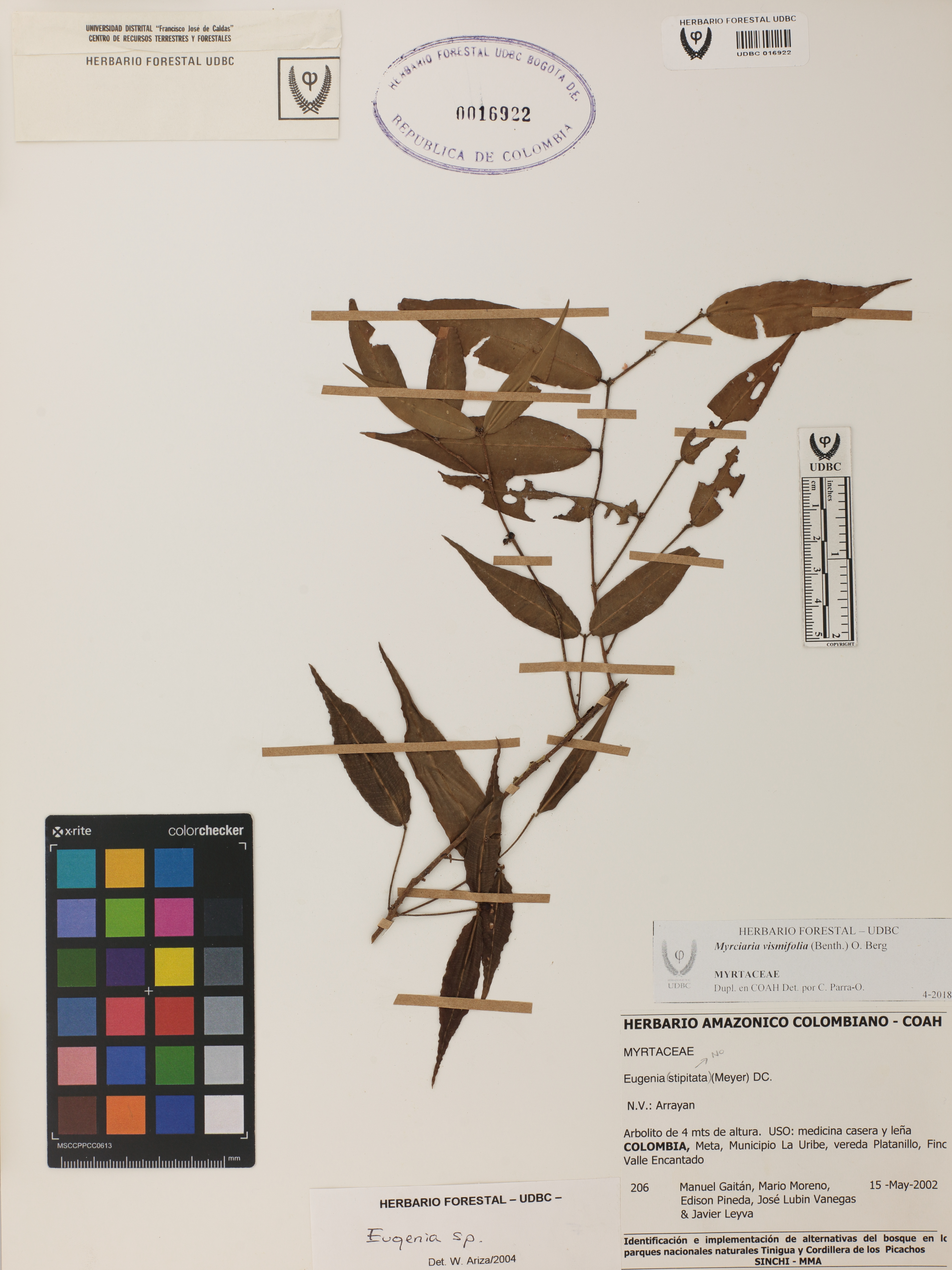 Fotografía del ejemplar Gaitán, M. 206, determinado como Myrciaria vismifolia en el año 2018