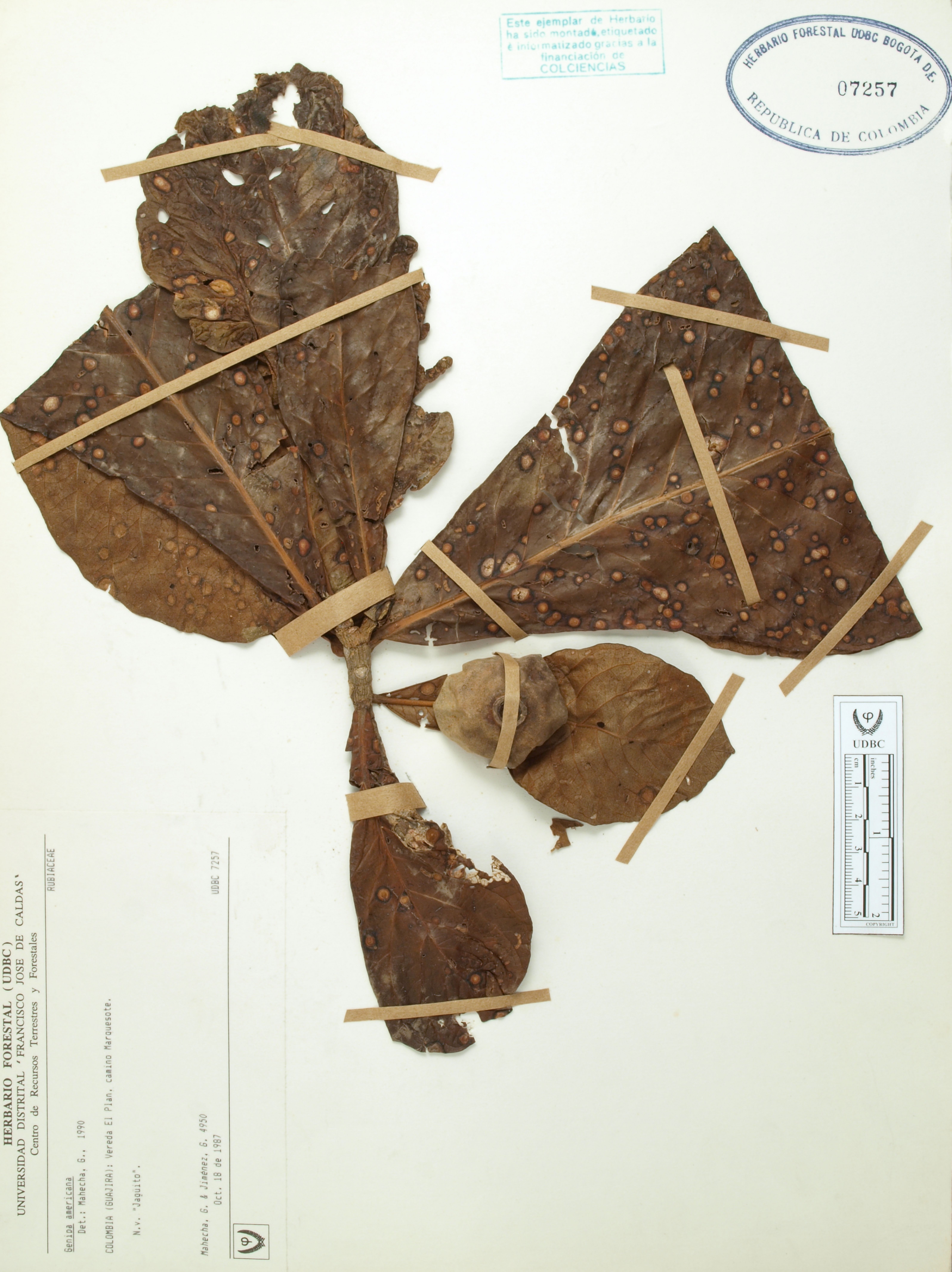 Fotografía del ejemplar Mahecha, G. 4950, determinado como Genipa americana en el año 1990