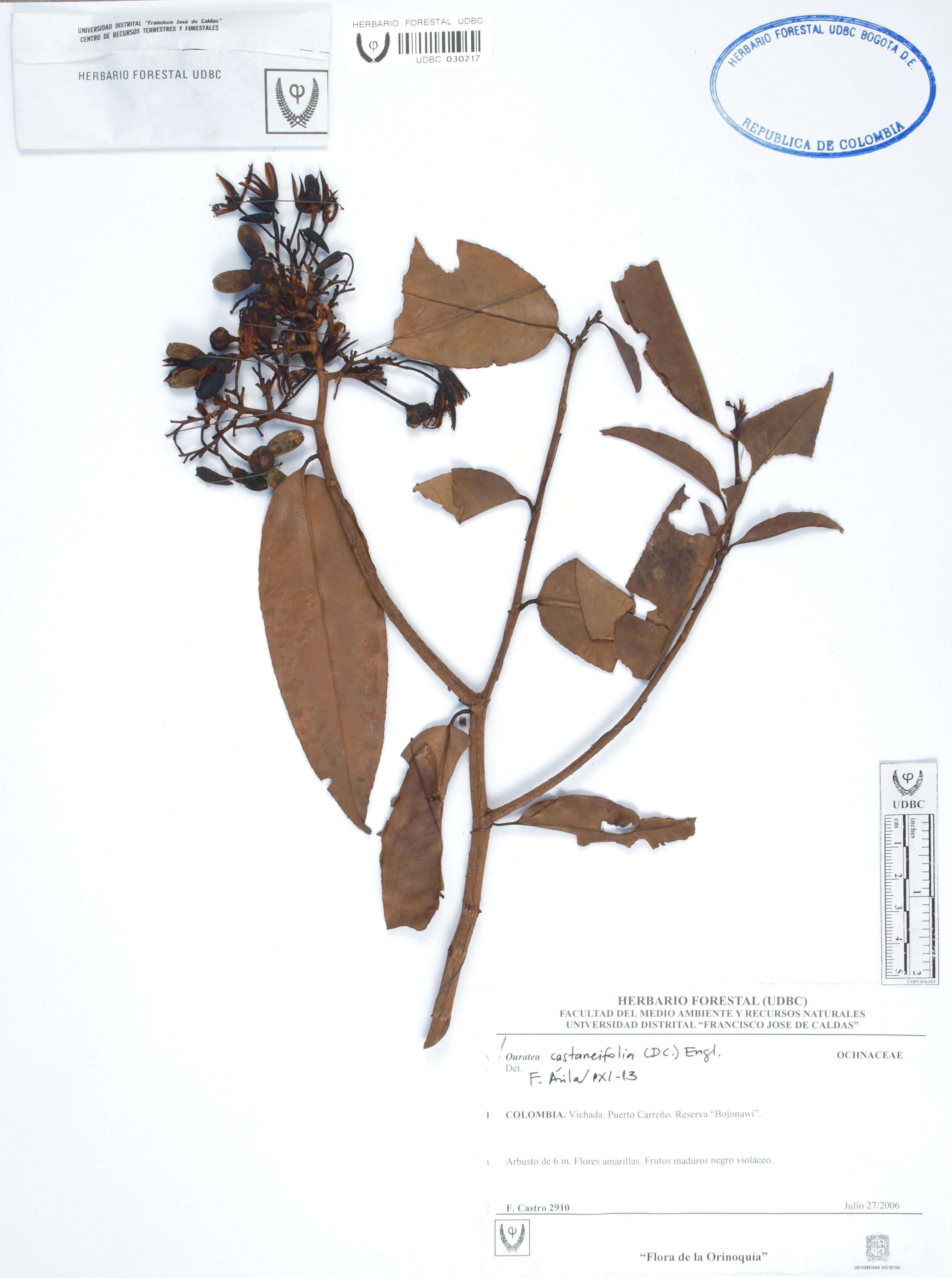 Fotografía del ejemplar Castro, F. 2910, determinado como Ouratea castaneifolia en el año 2013