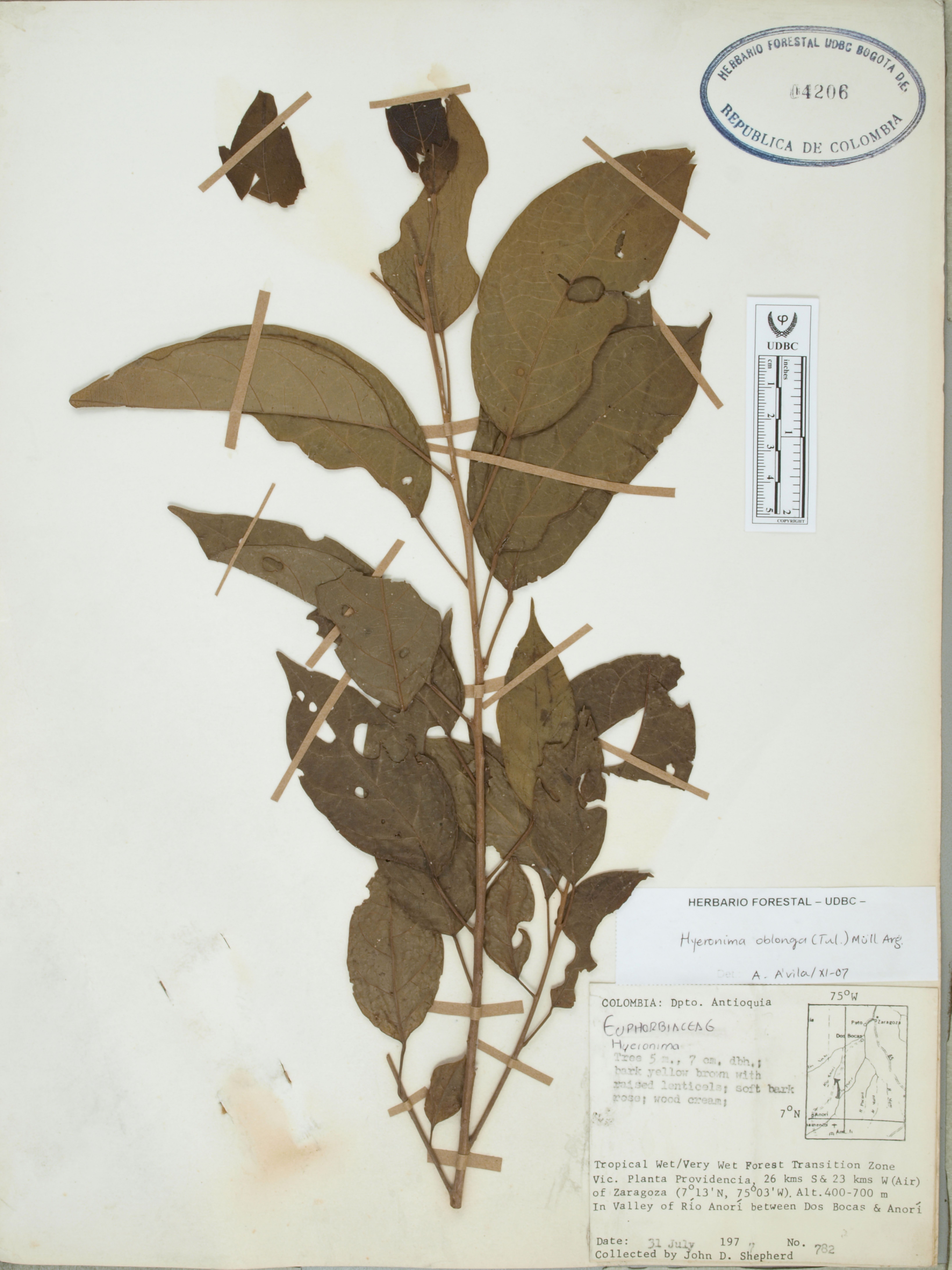 Fotografía del ejemplar Shepherd, J. 782, determinado como Hieronyma oblonga en el año 2007