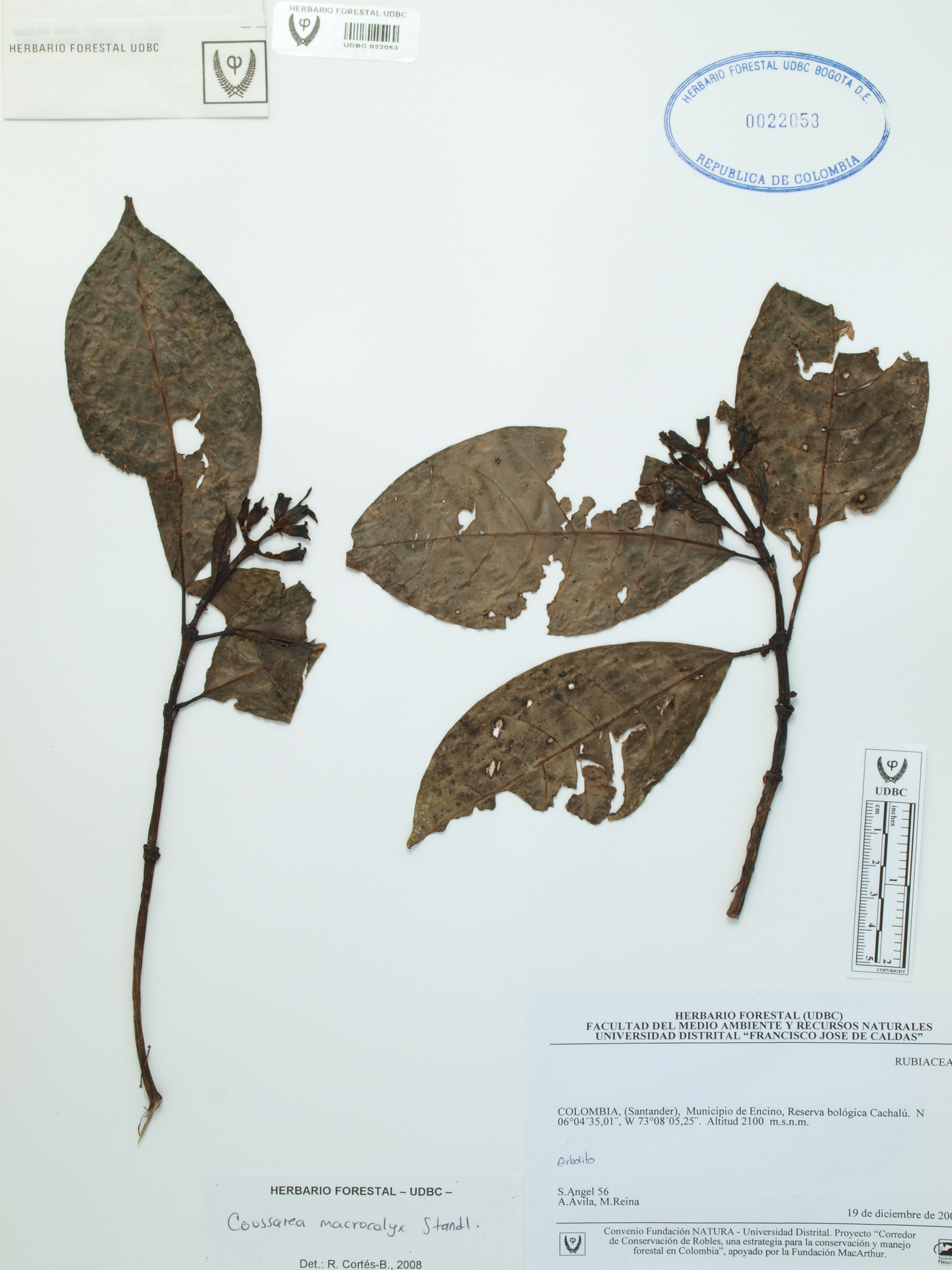 Fotografía del ejemplar Ángel, S. 56, determinado como Coussarea macrocalyx en el año 2008