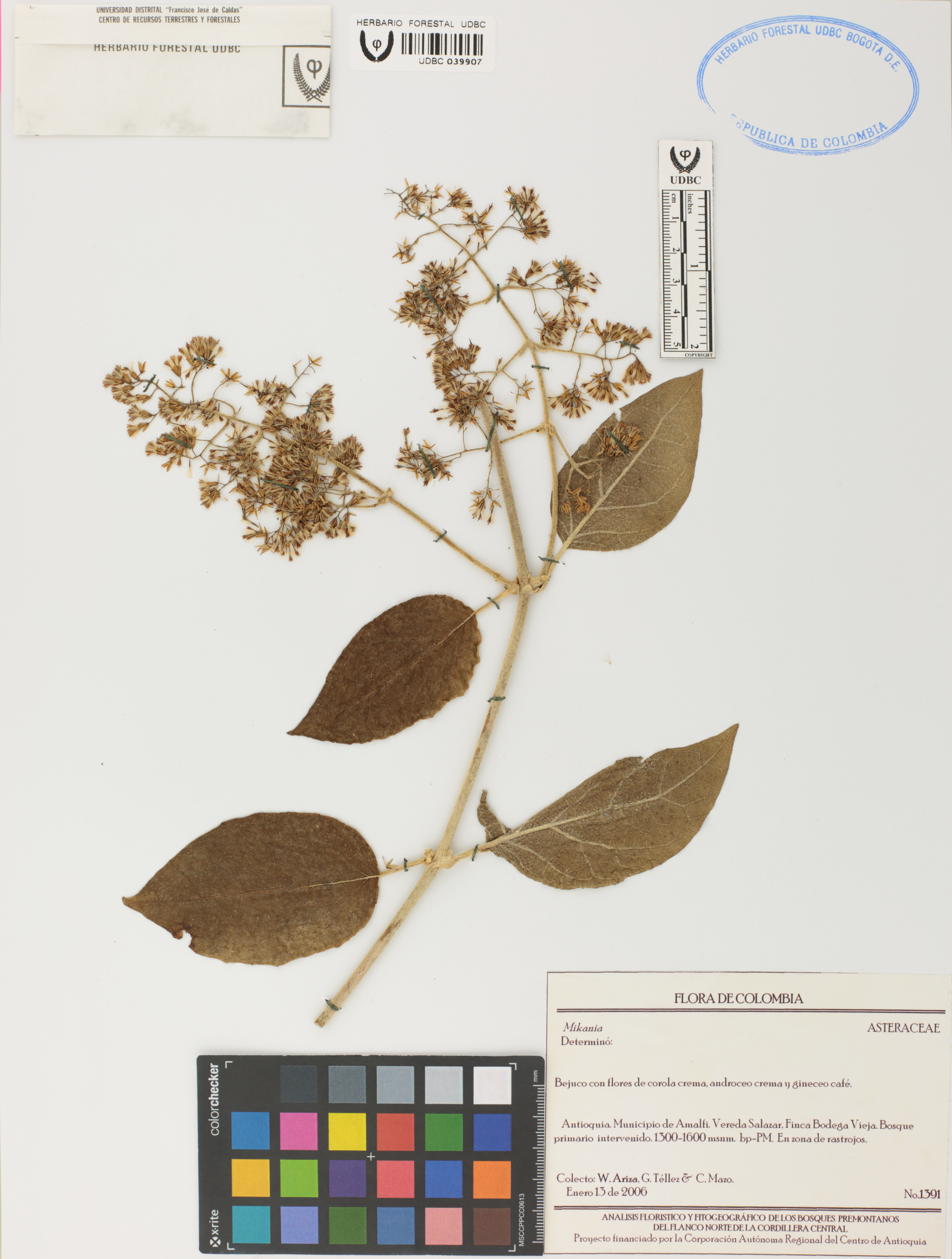 Fotografía del ejemplar Ariza, W. 1391, determinado como Mikania sp.