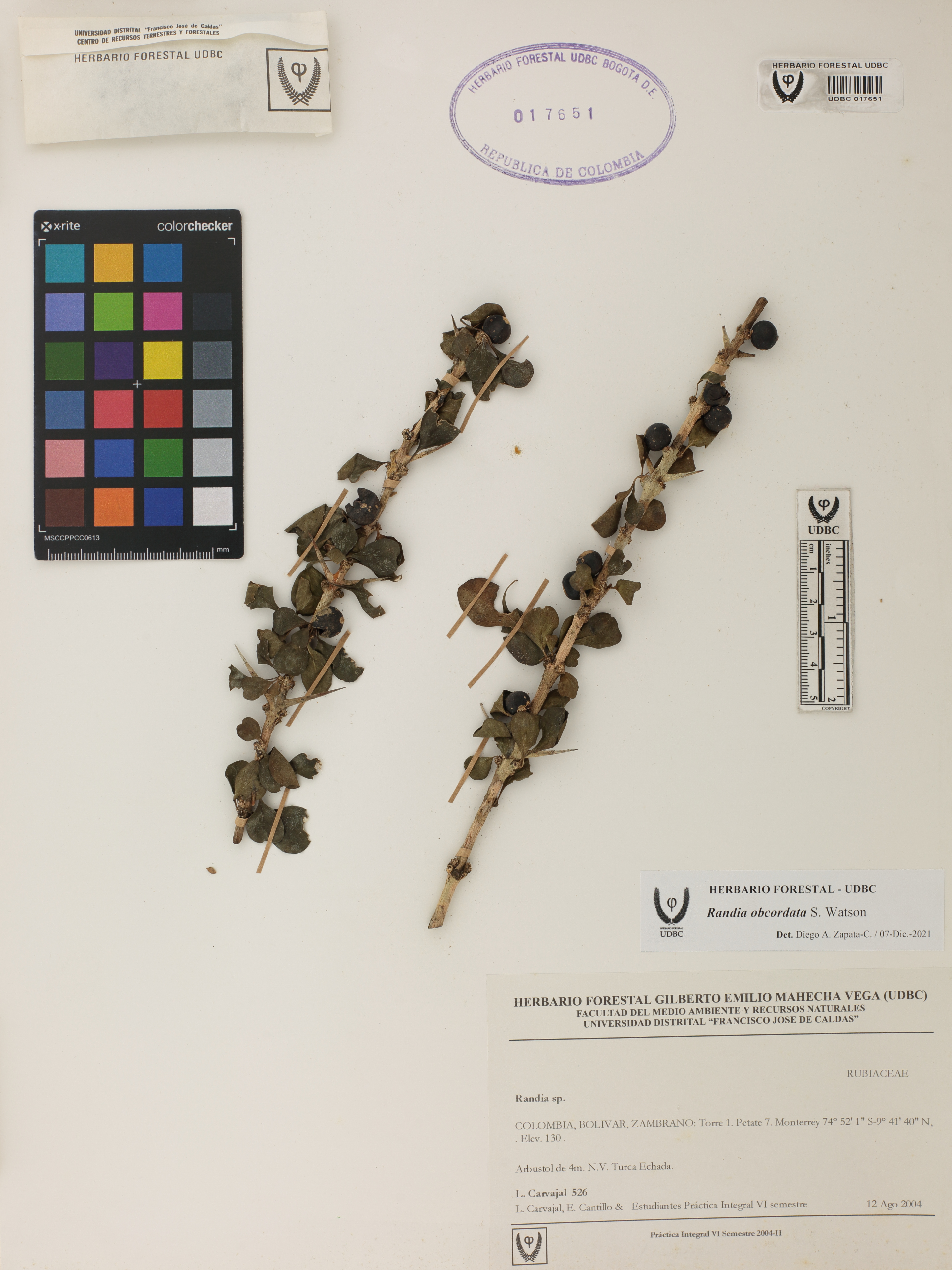 Fotografía del ejemplar Carvajal, L. 526, determinado como Randia obcordata en el año 2021