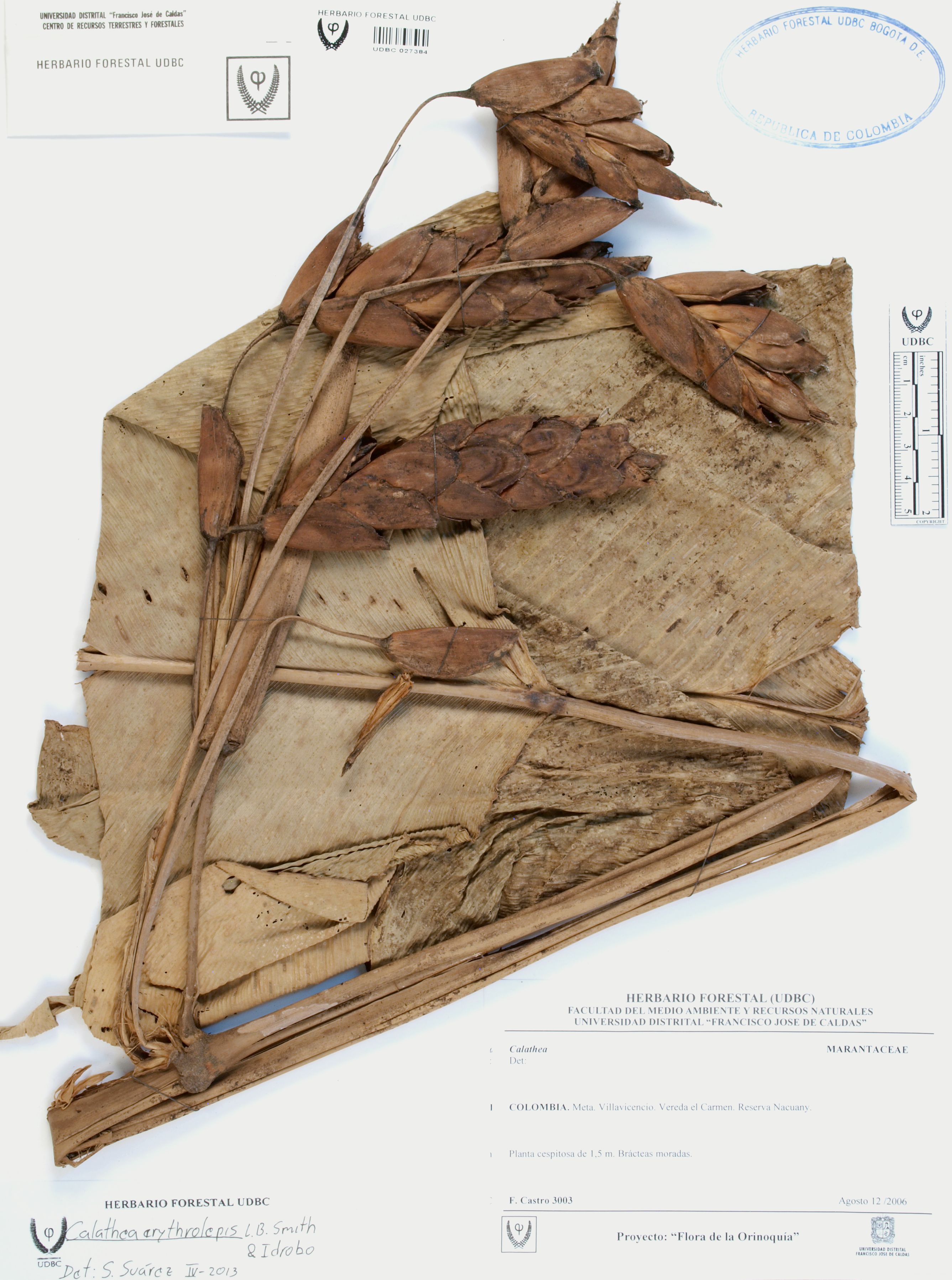 Fotografía del ejemplar Castro, F. 3003, determinado como Calathea erythrolepis en el año 2013