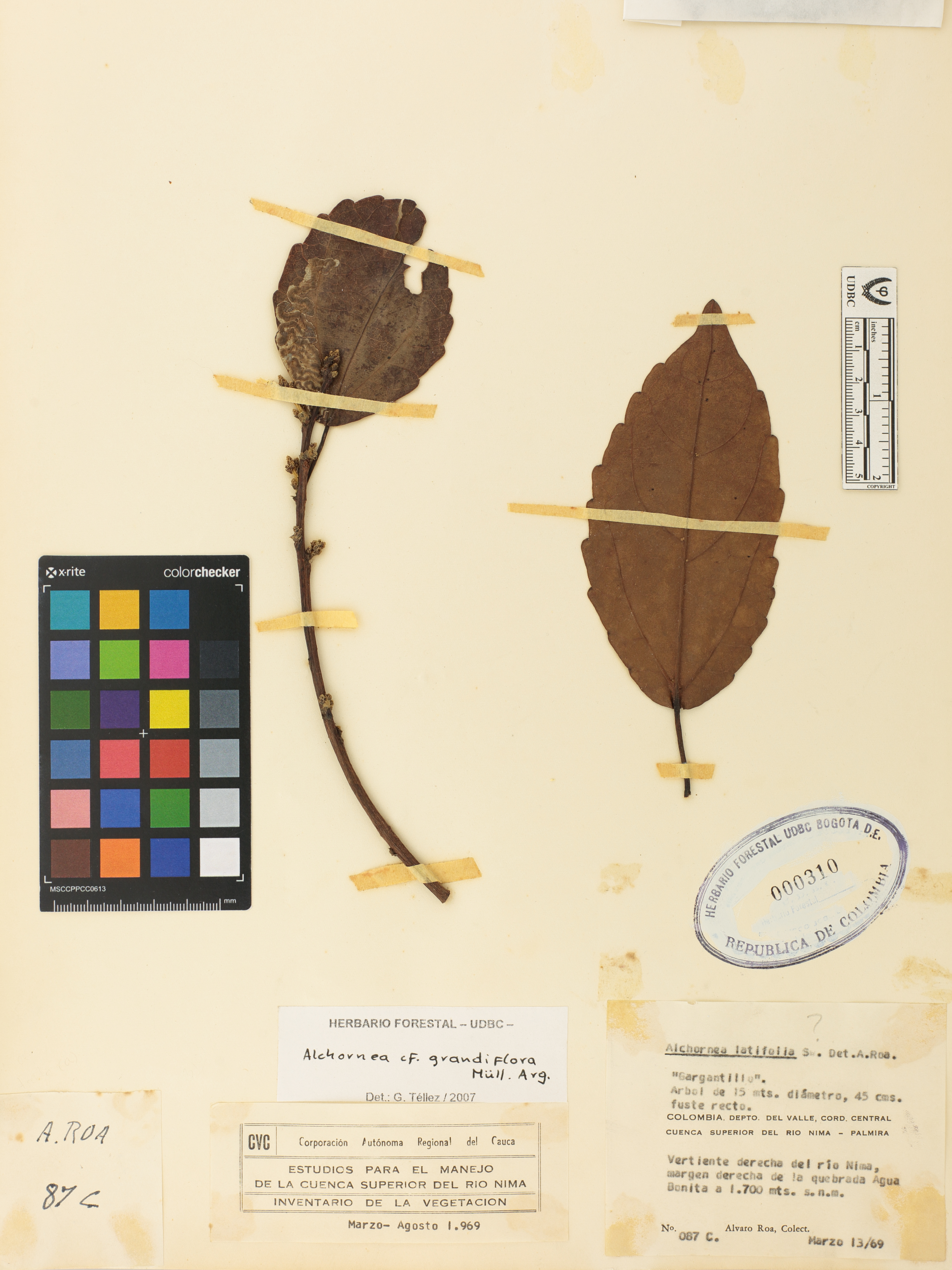 Fotografía del ejemplar Roa, A. 87, determinado como Alchornea grandiflora en el año 2007