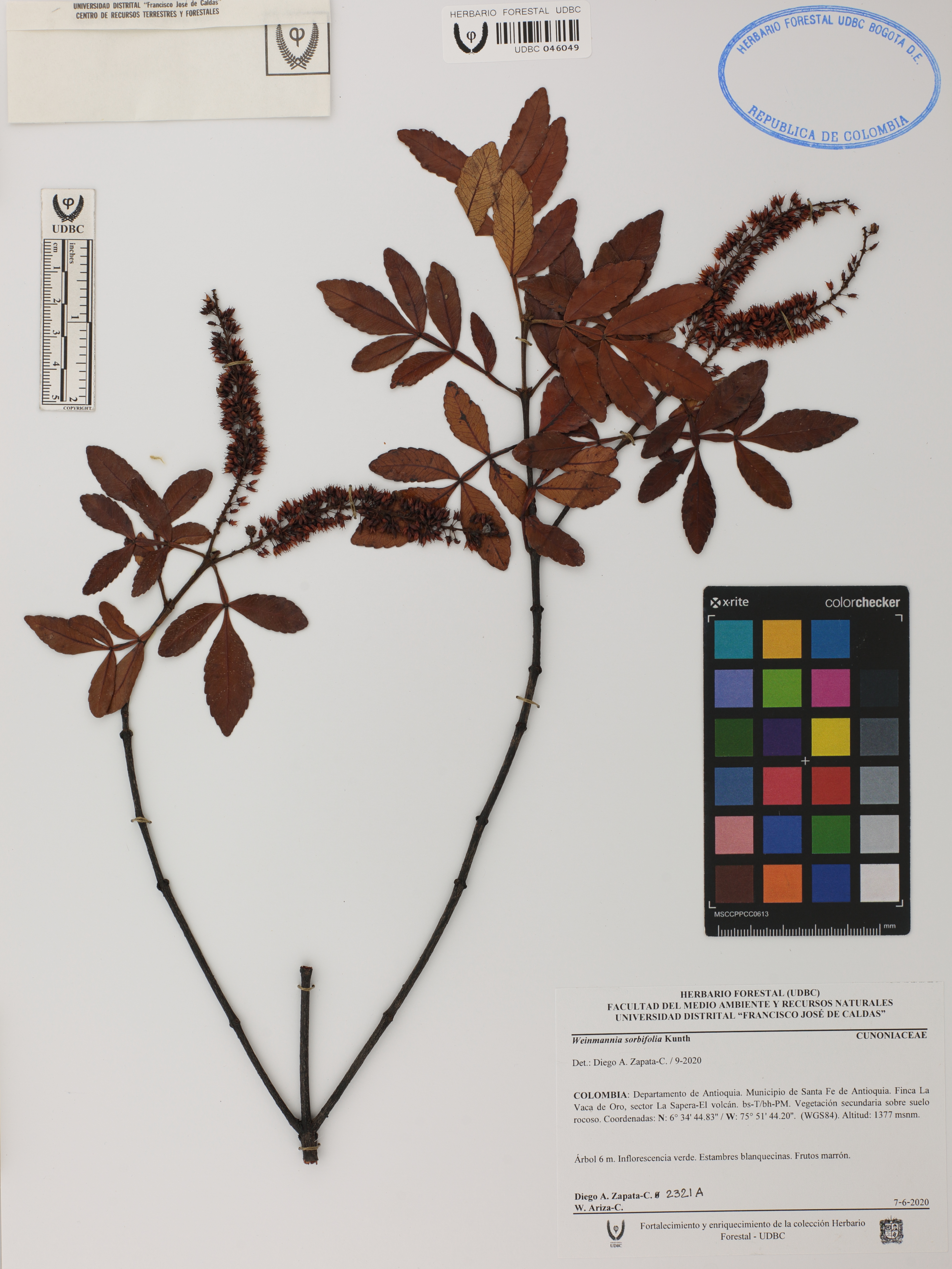 Fotografía del ejemplar Zapata-C., D. 2321A, determinado como Weinmannia sorbifolia en el año 2020