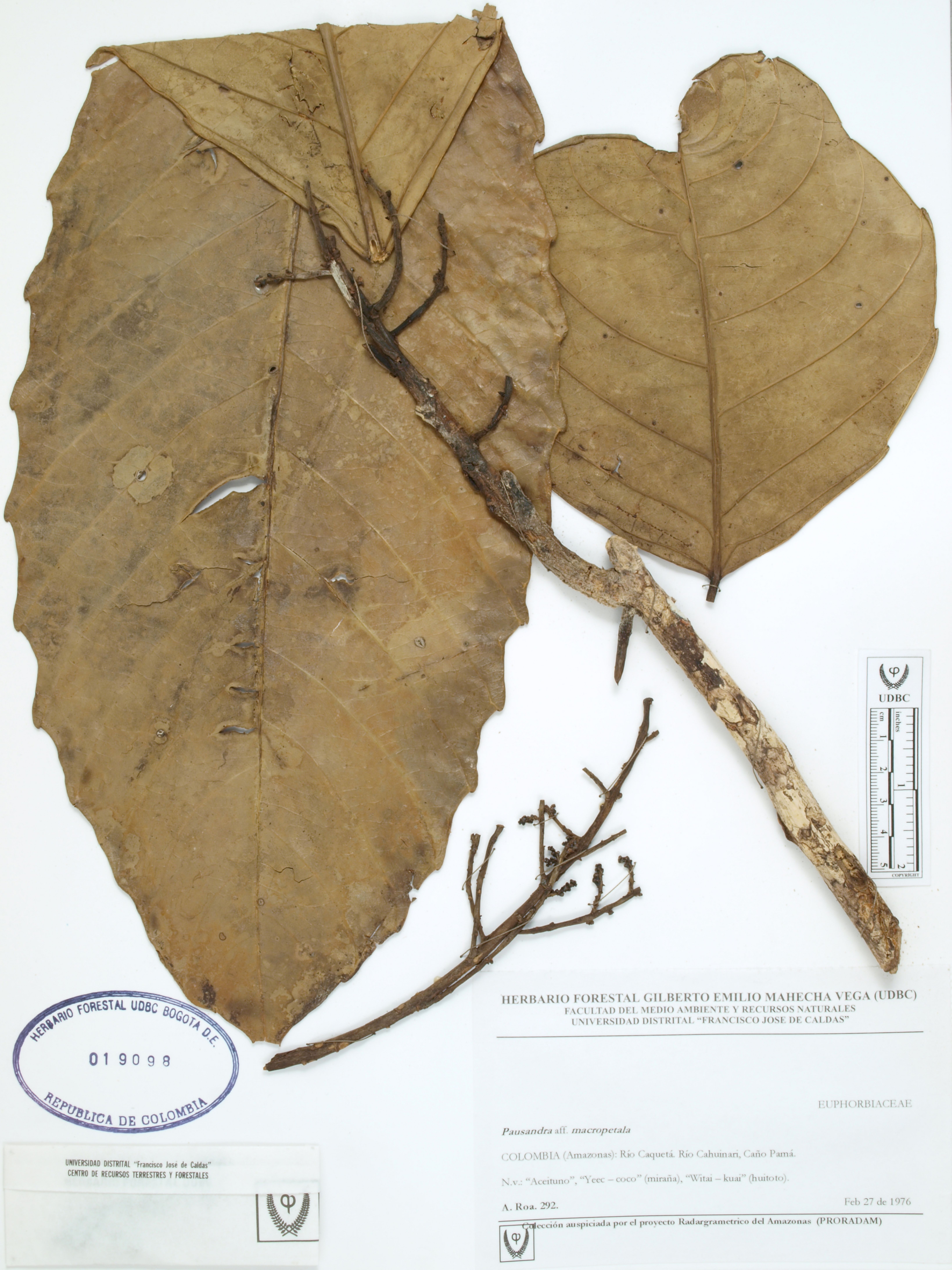 Fotografía del ejemplar Roa, A. 292, determinado como Pausandra macropetala en el año 2007