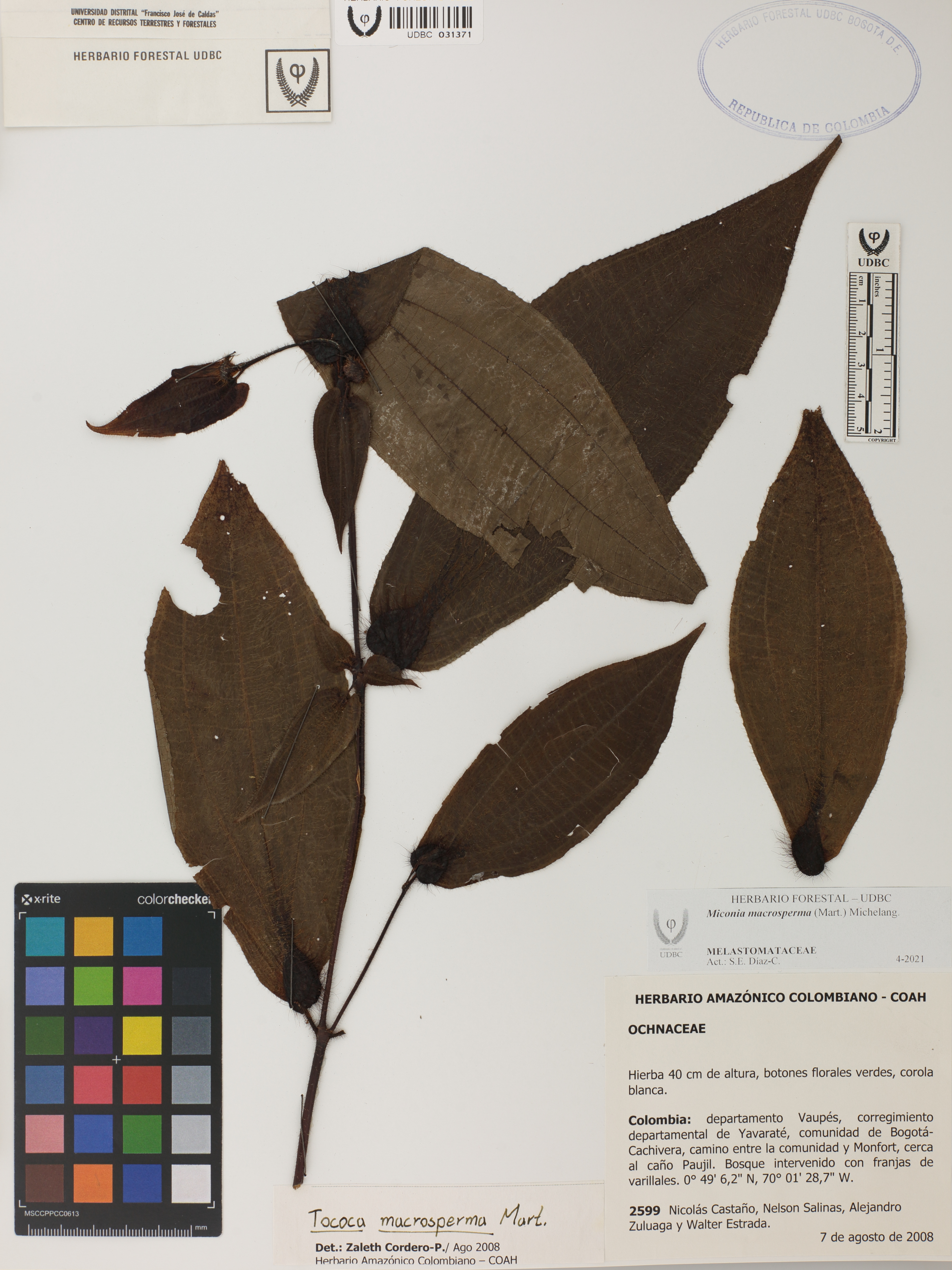 Fotografía del ejemplar Castaño, N. 2599, determinado como Miconia macrosperma en el año 2008