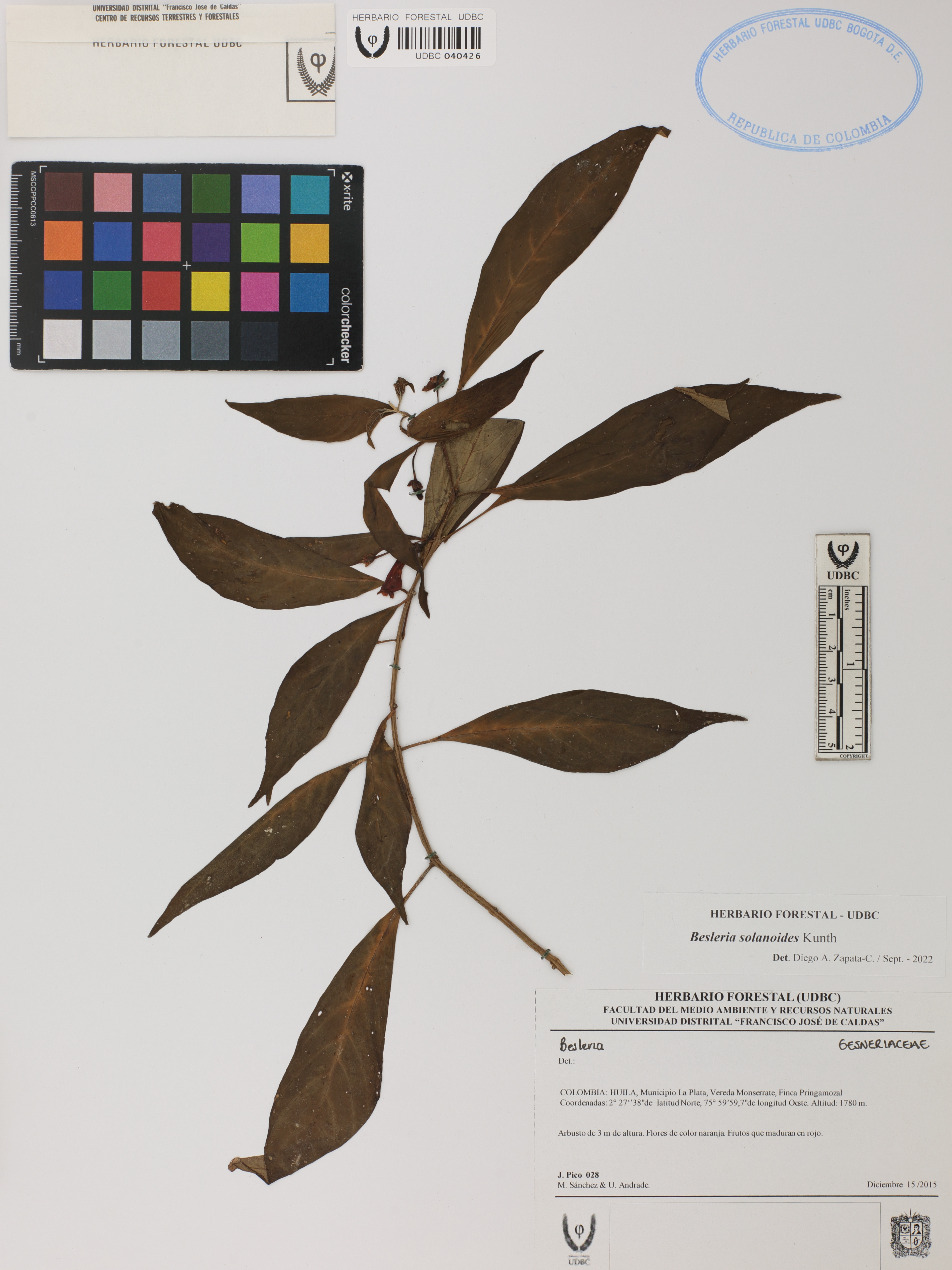Fotografía del ejemplar Pico, J. 28, determinado como Besleria solanoides en el año 2022
