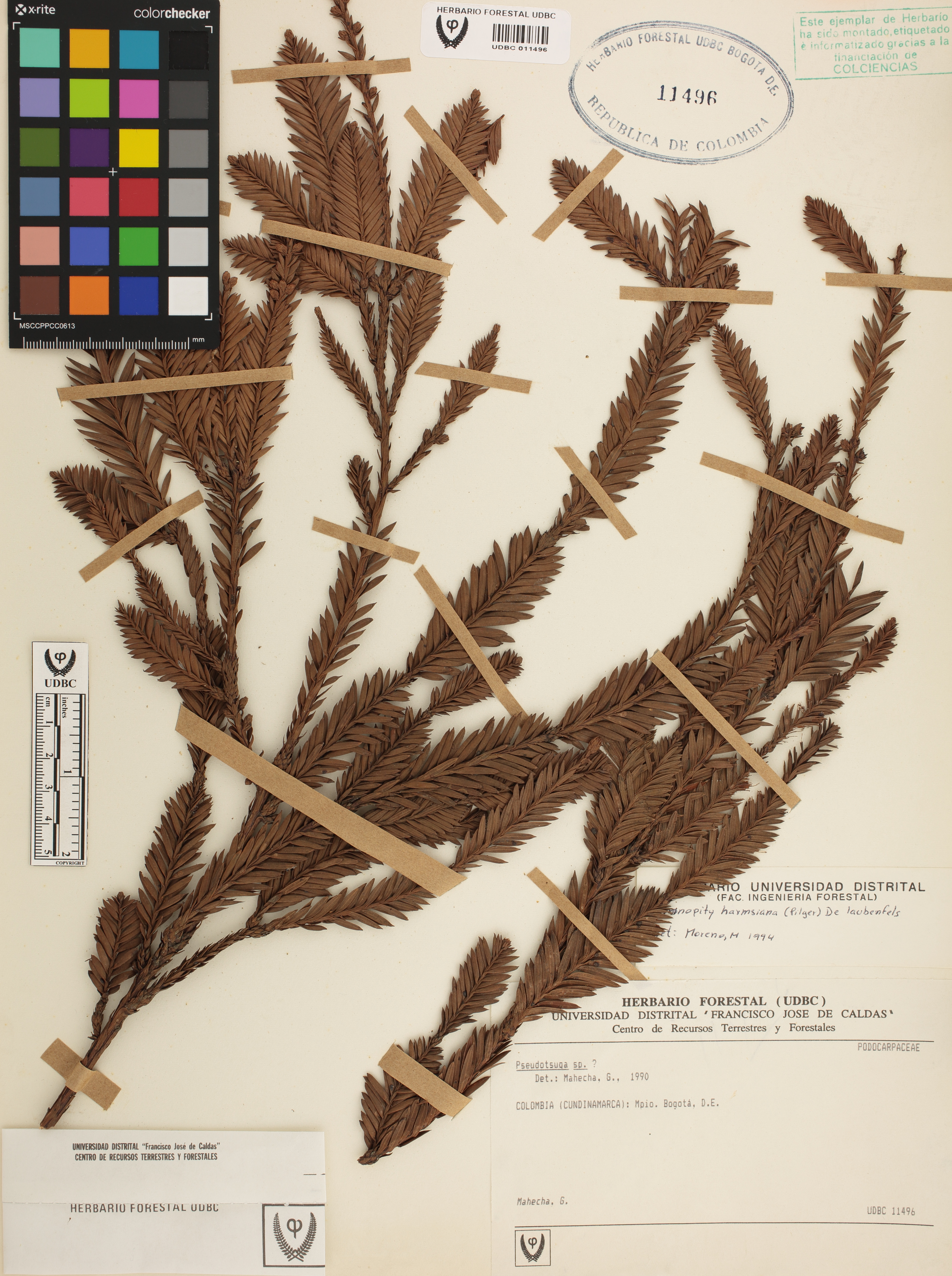 Fotografía del ejemplar Mahecha, G., determinado como Prumnopitys harmsiana en el año 1994