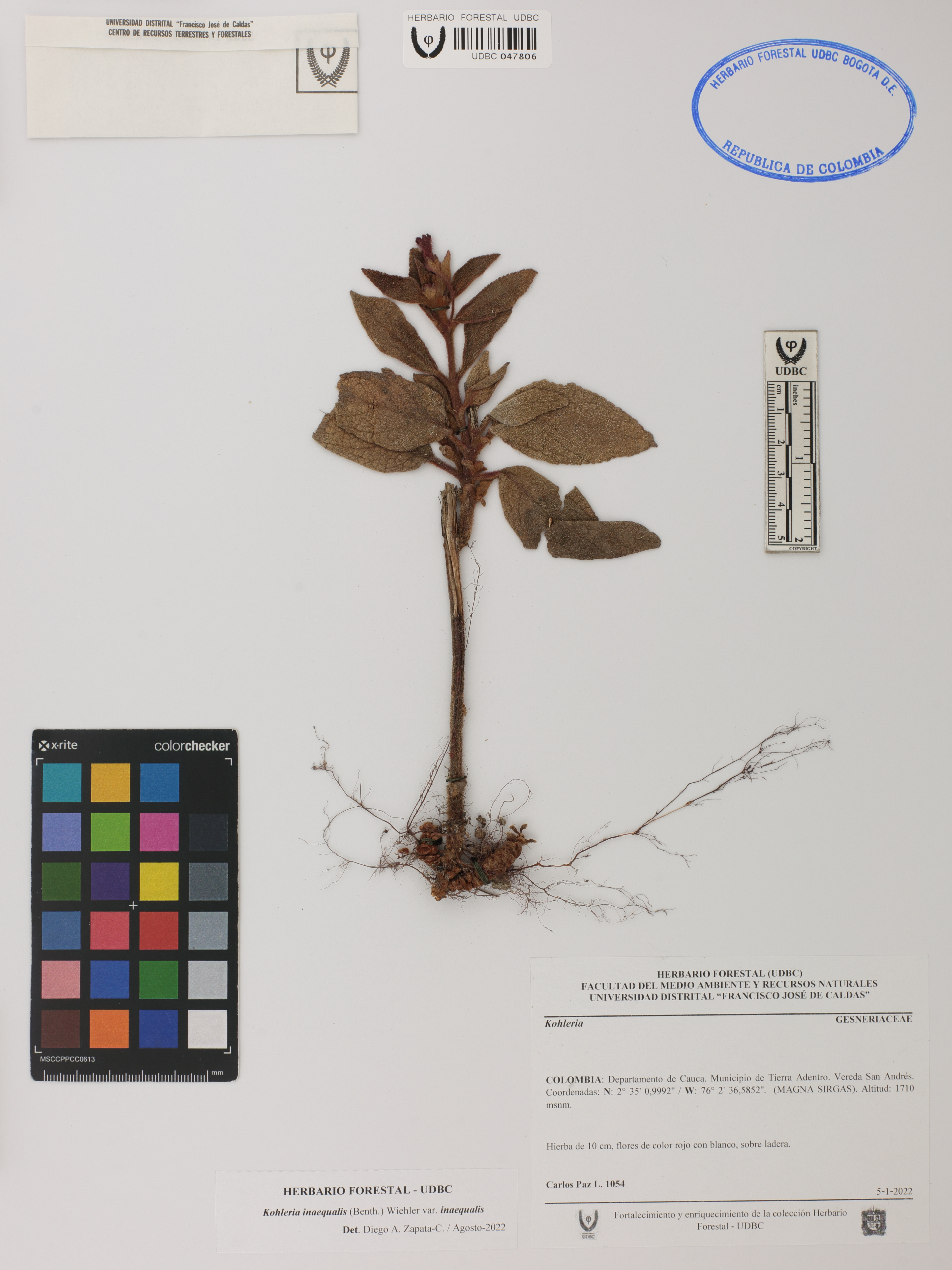 Fotografía del ejemplar Paz-L., C. 1054, determinado como Kohleria inaequalis var. inaequalis en el año 2022
