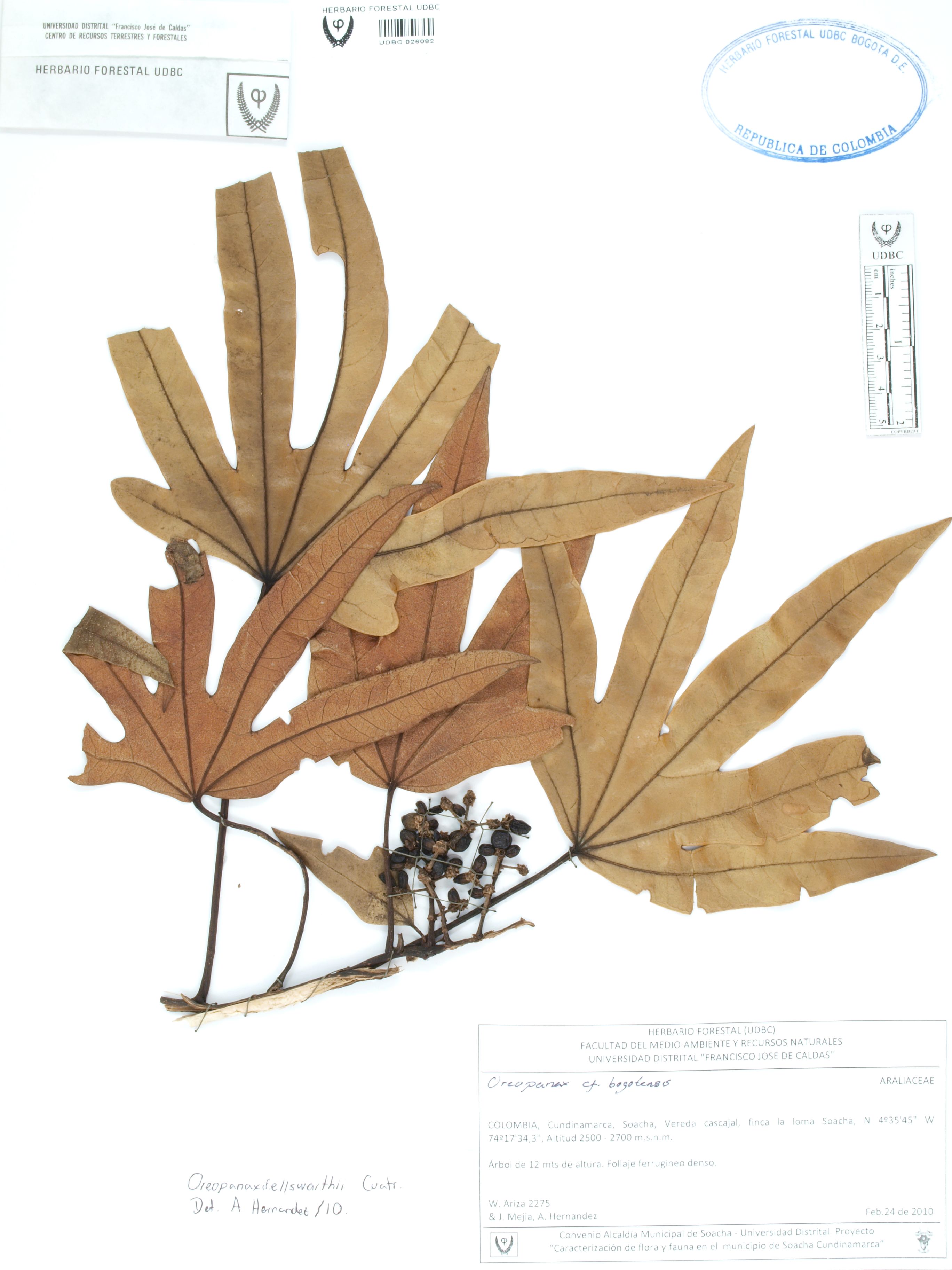 | dc.description | Fotografía del ejemplar Ariza, W. 2275, determinado como Oreopanax ellsworthii en el año 2010 | |