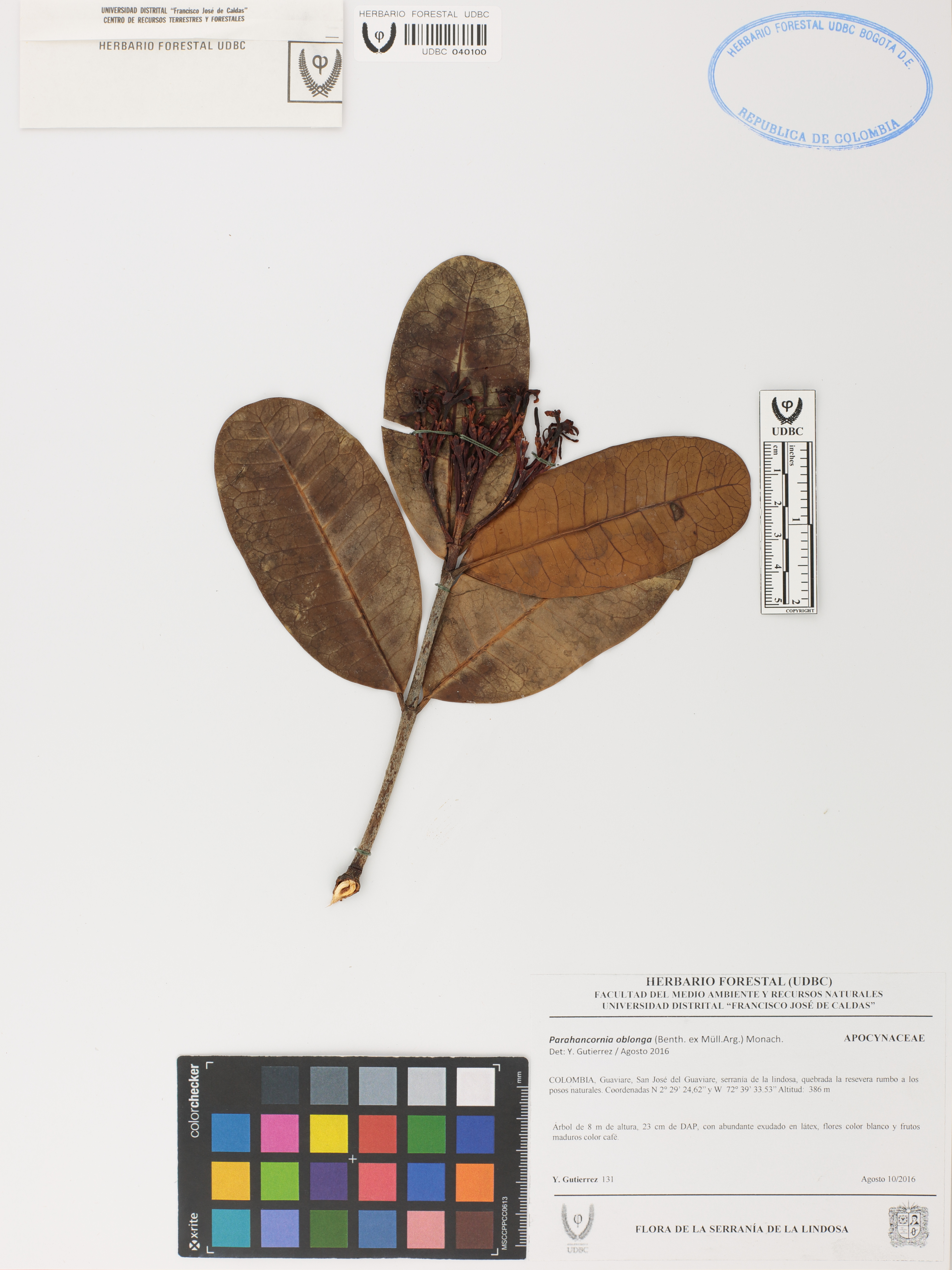 Fotografía del ejemplar Gutiérrez, Y. 131, determinado como Parahancornia oblonga en el año 2016