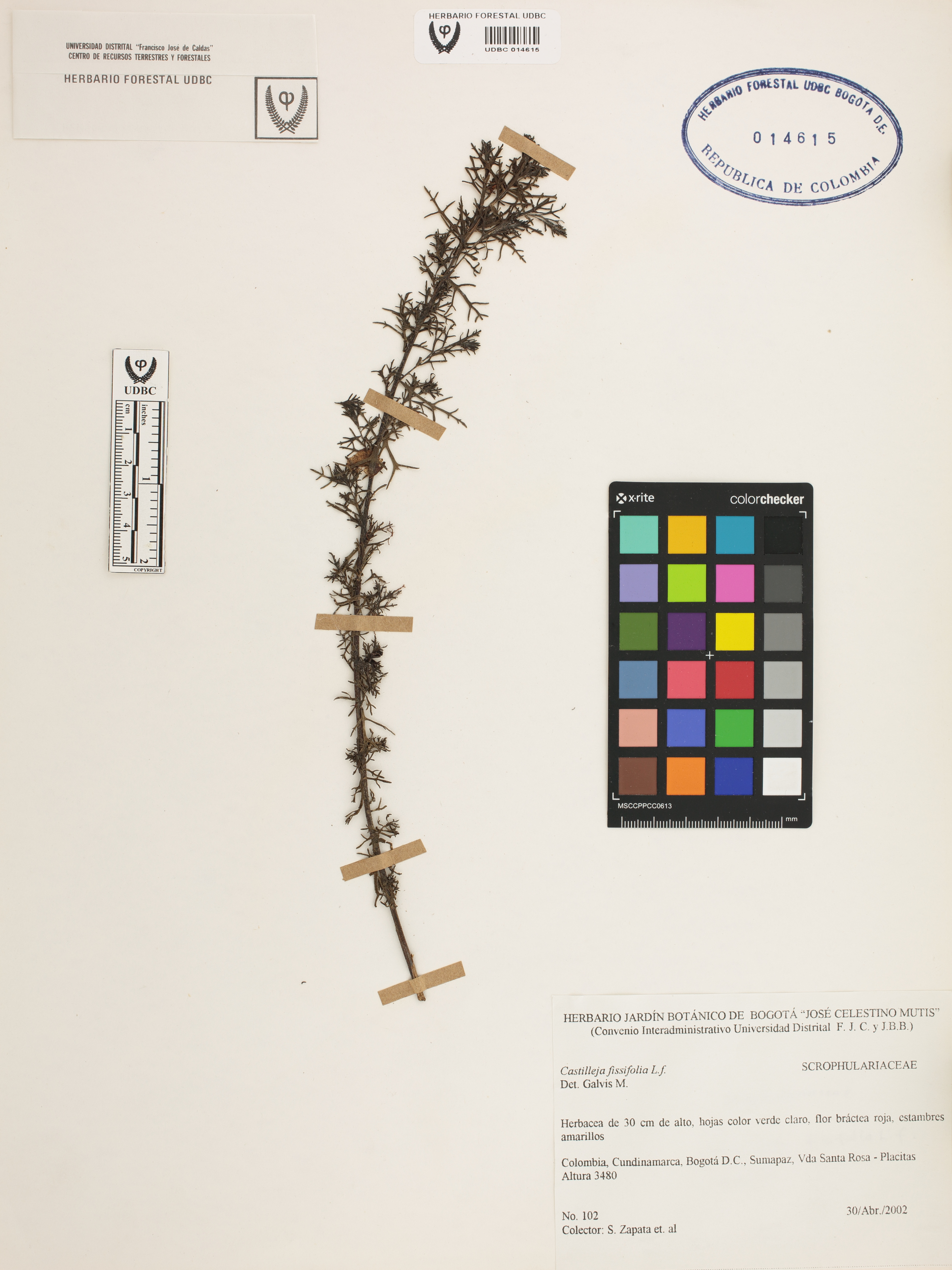 Fotografía del ejemplar Zapata, S. 102, determinado como Castilleja fissifolia