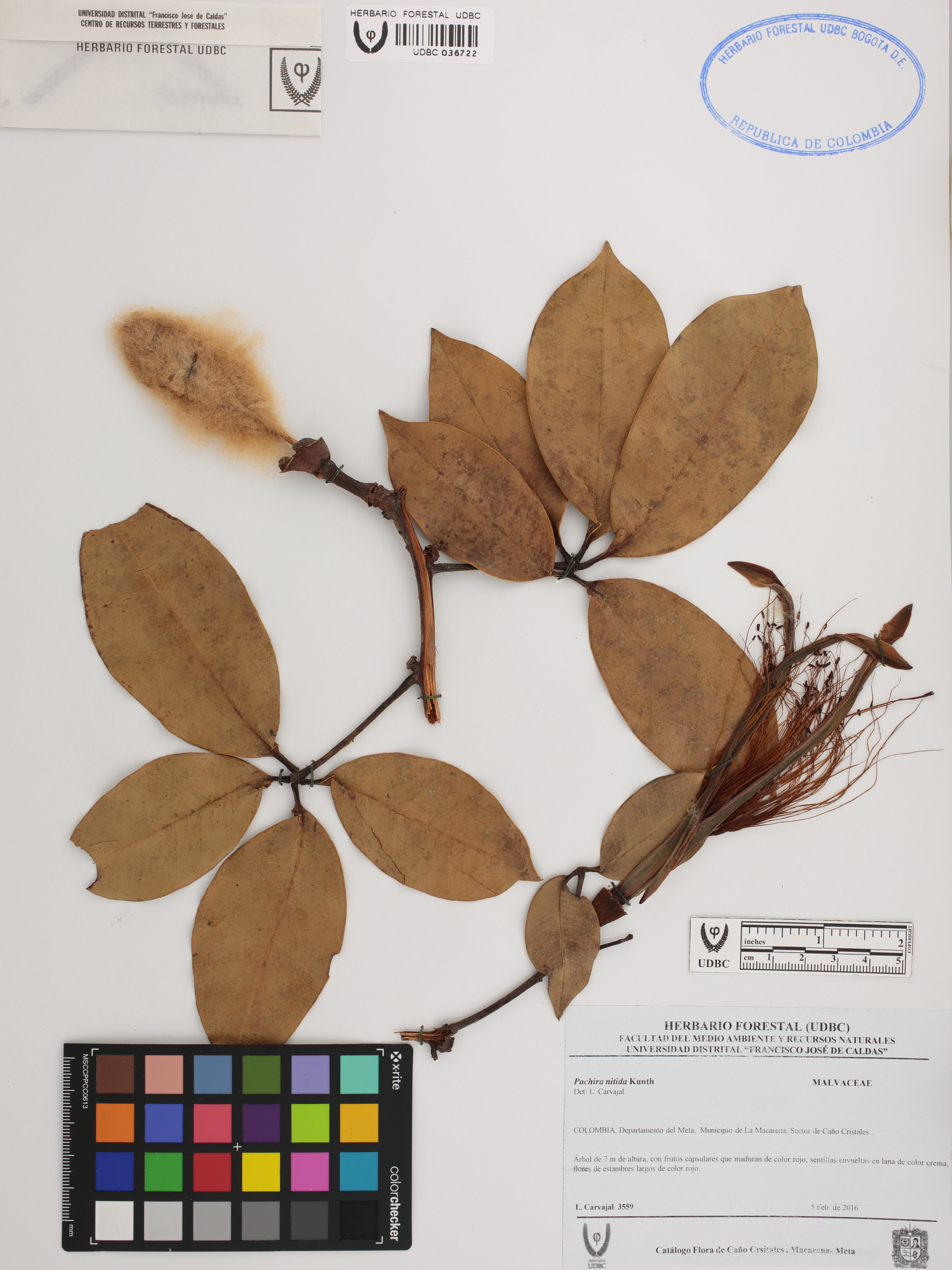 Fotografía del ejemplar Carvajal, L. 3559, determinado como Pachira nitida