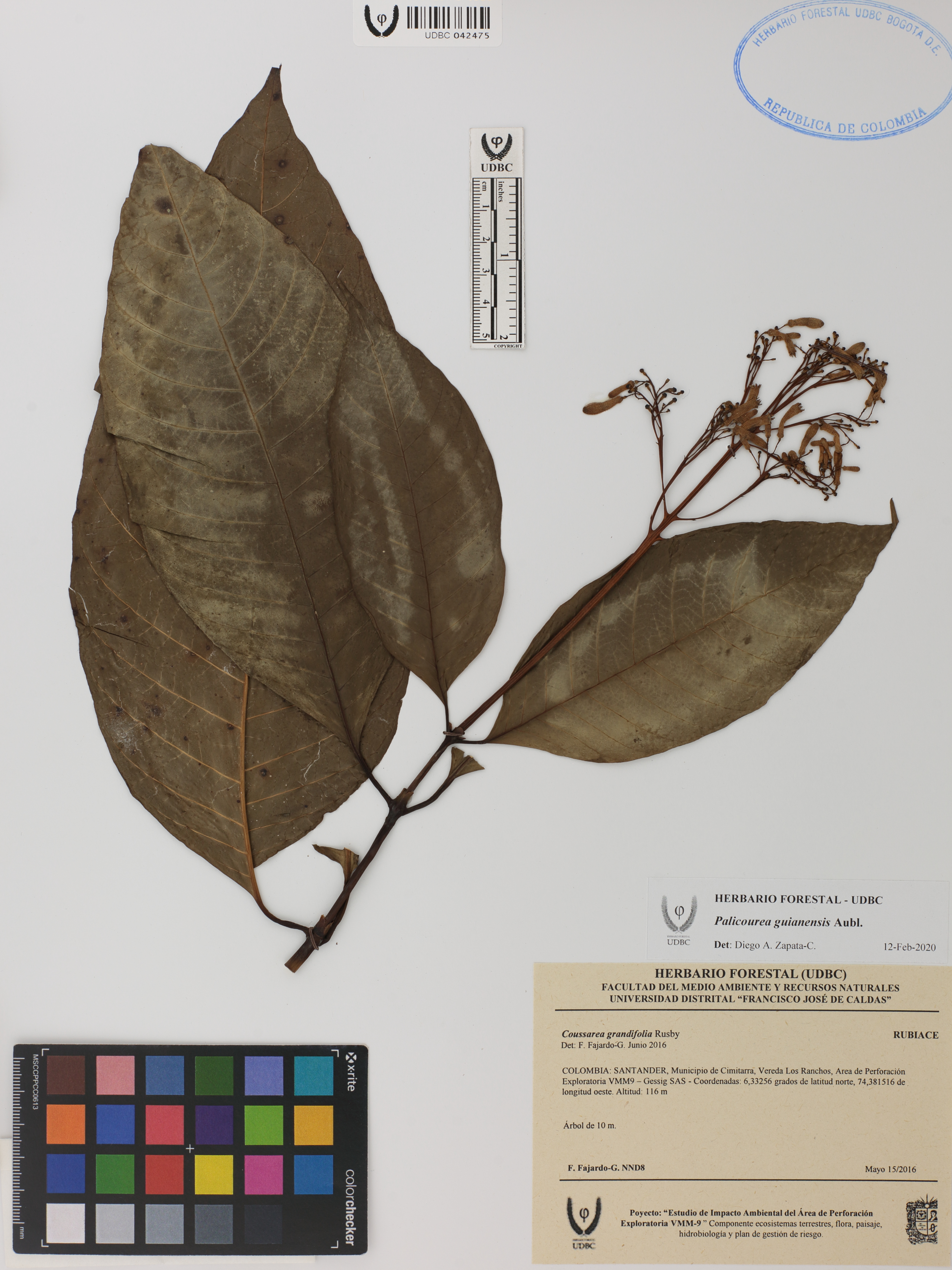Fotografía del ejemplar Fajardo-G., F. 8, determinado como Palicourea guianensis en el año 2020