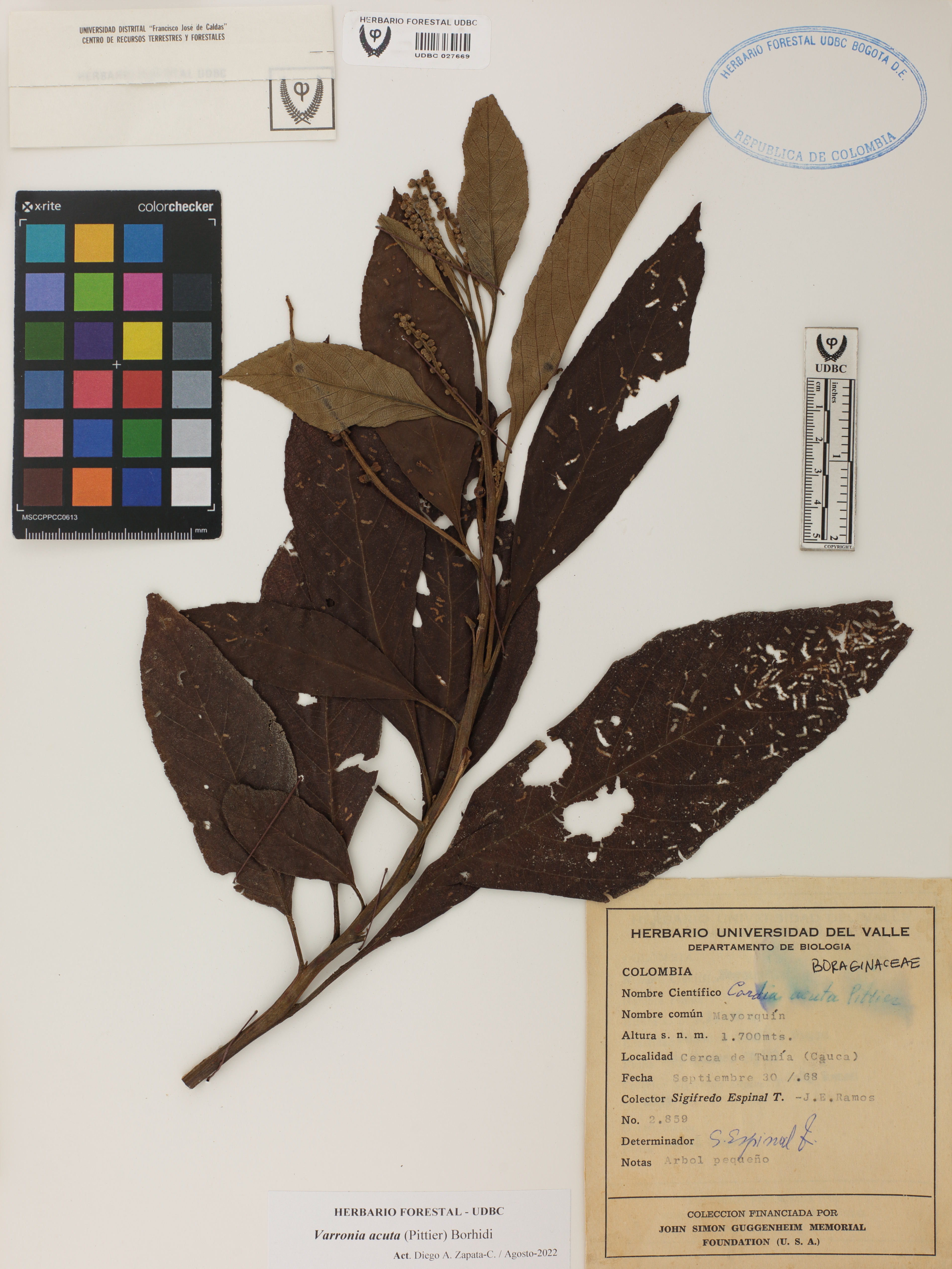 Fotografía del ejemplar SD 2859, determinado como Varronia acuta en el año 1968