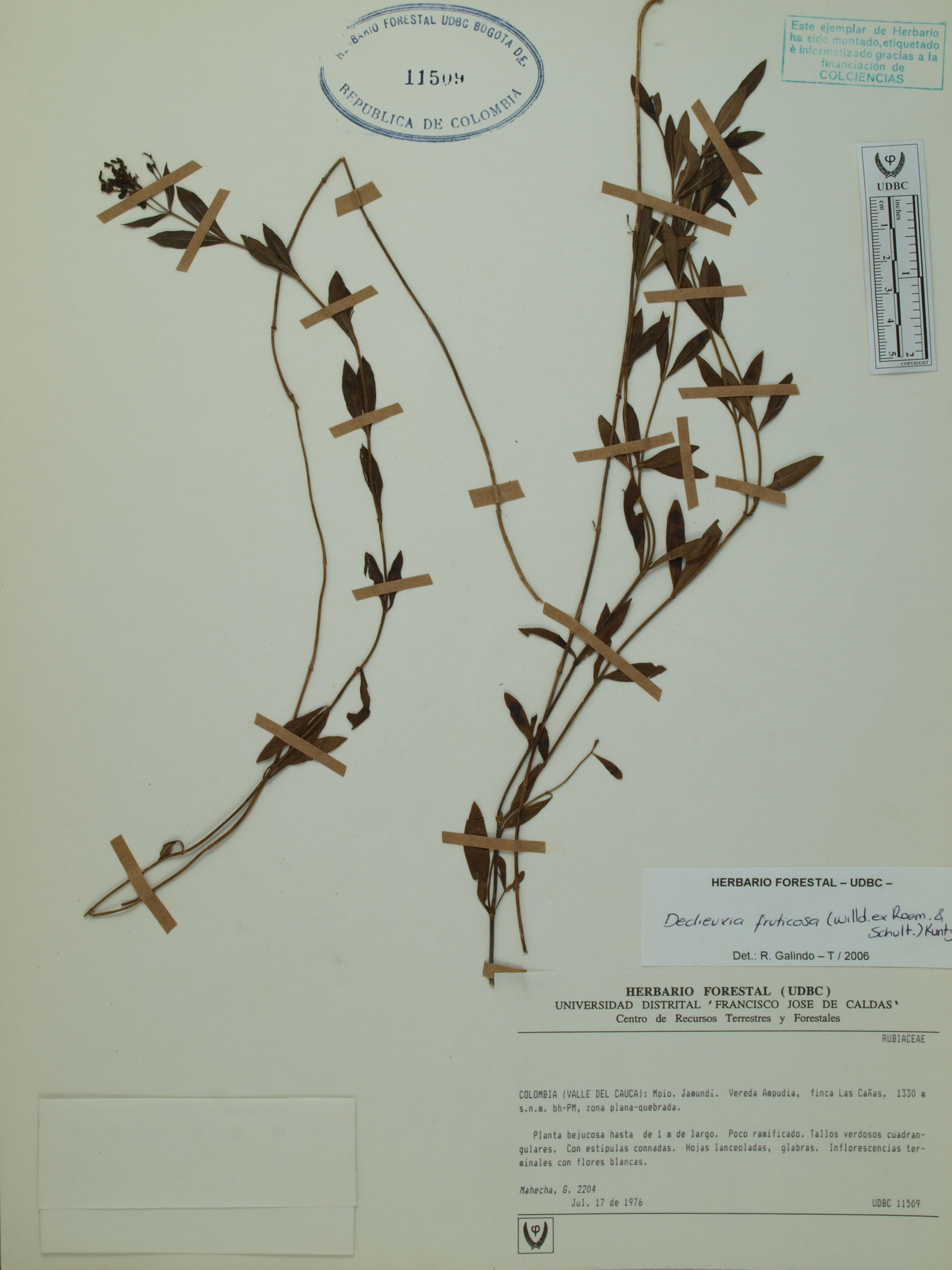 Fotografía del ejemplar Mahecha, G. 2204, determinado como Declieuxia fruticosa en el año 2006