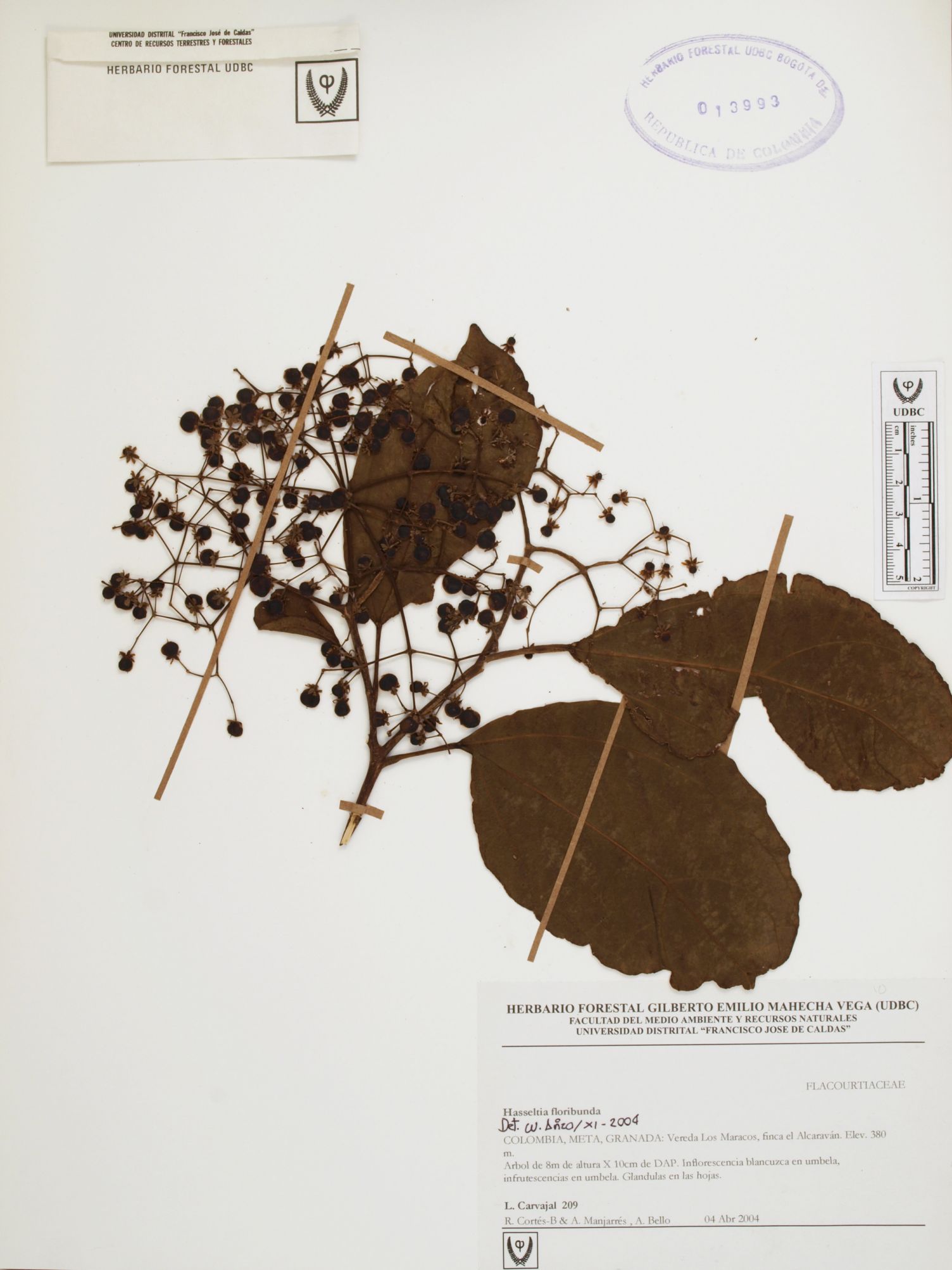 Fotografía del ejemplar Carvajal, L. 209, determinado como Hasseltia floribunda en el año 2004
