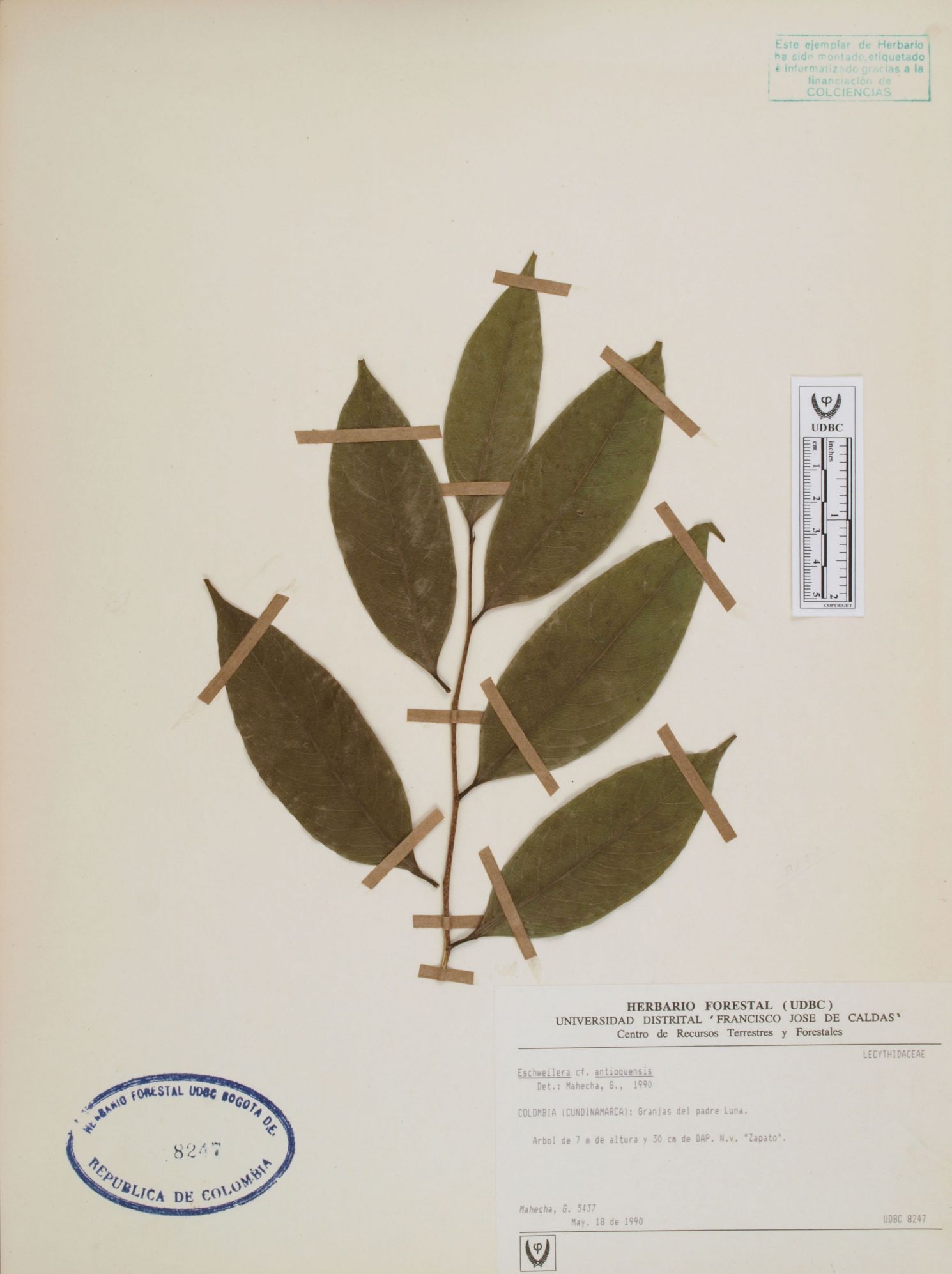 Fotografía del ejemplar Mahecha, G. 5437, determinado como Eschweilera antioquensis en el año 1990