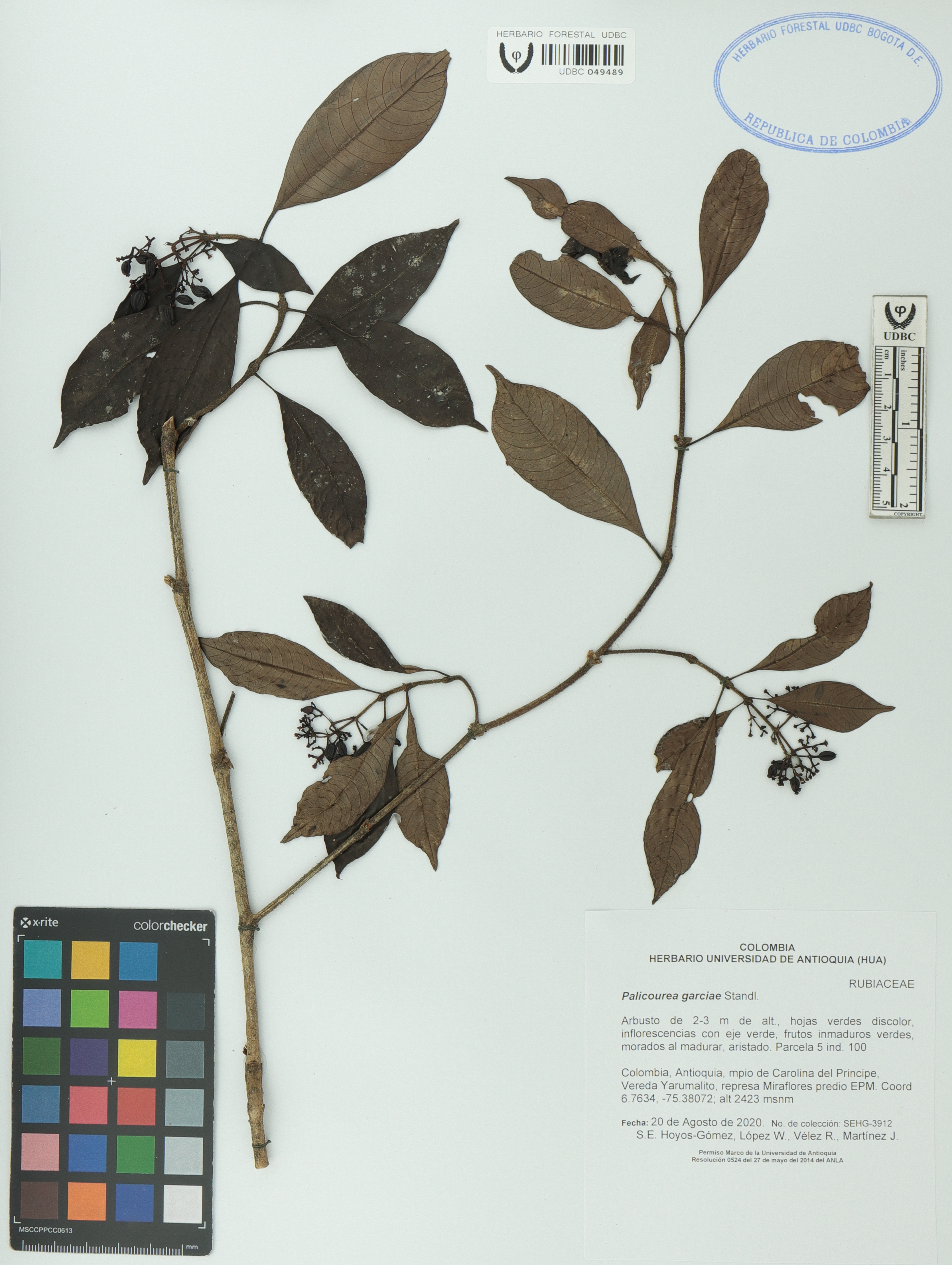 Fotografía del ejemplar Hoyos-Gómez, S. 3912, determinado como Palicourea garciae