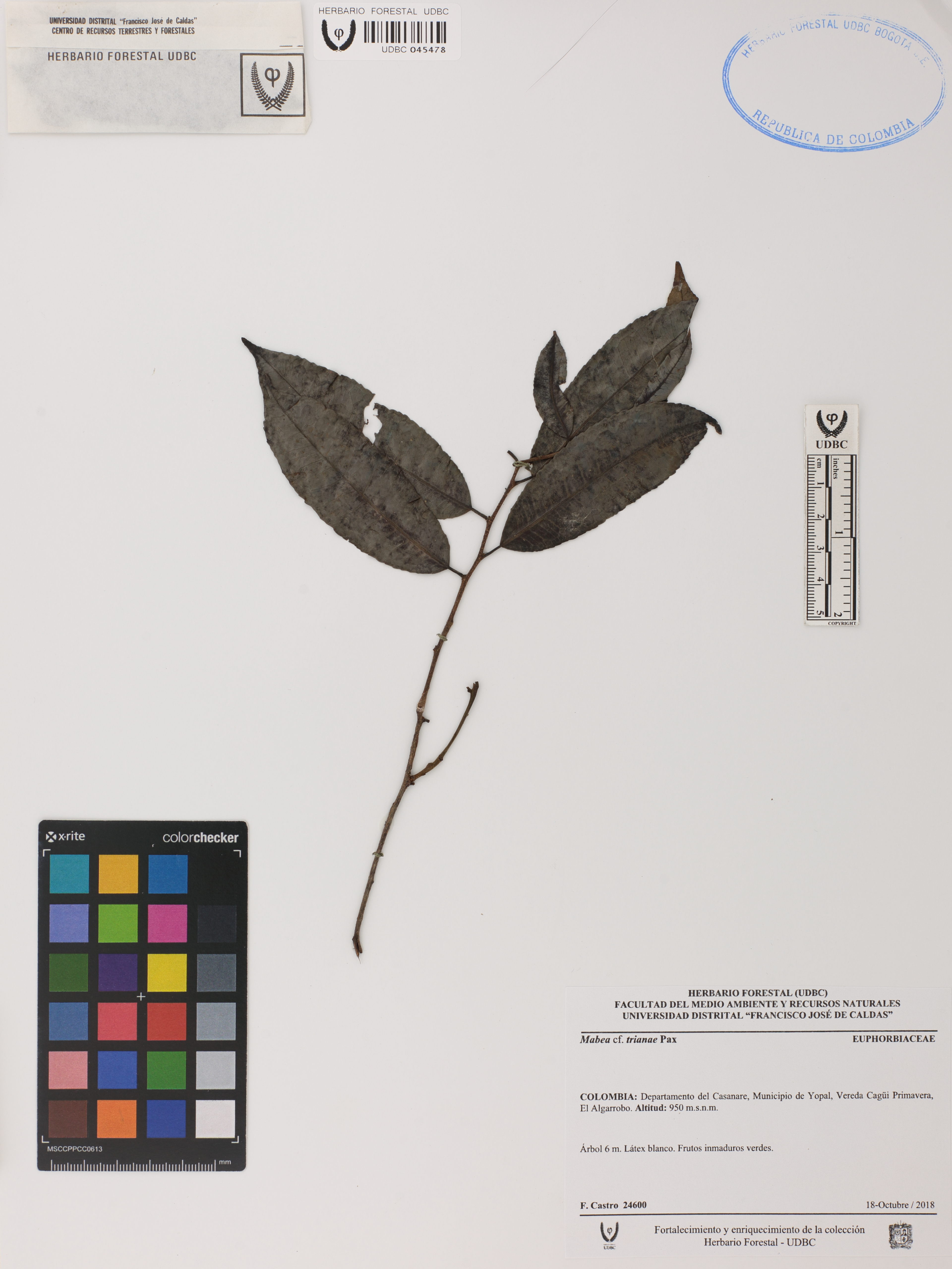 Fotografía del ejemplar Castro, F. 24600, determinado como Mabea trianae en el año 2018