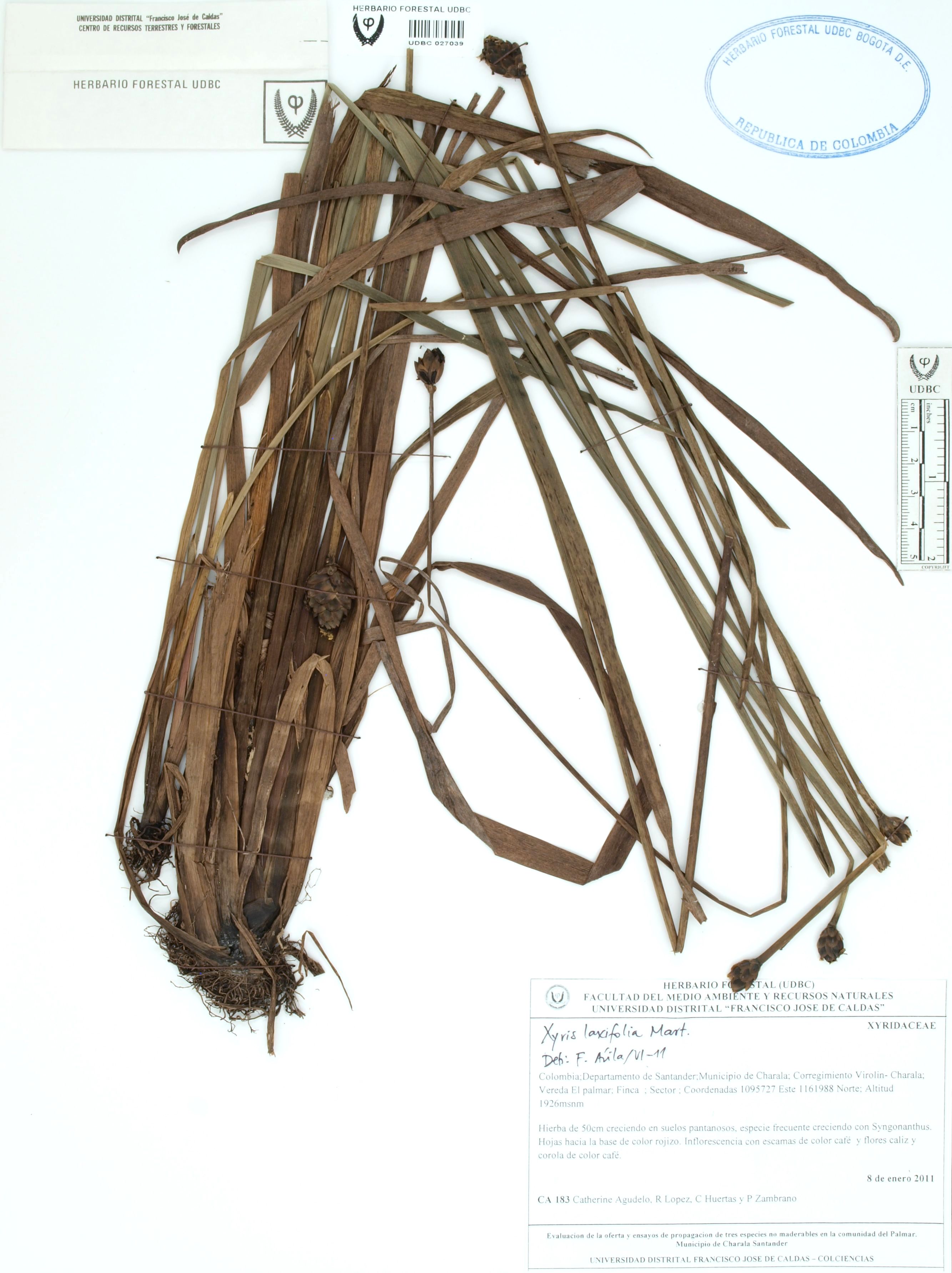 Fotografía del ejemplar Agudelo, C. 183, determinado como Xyris laxiflora en el año 2011