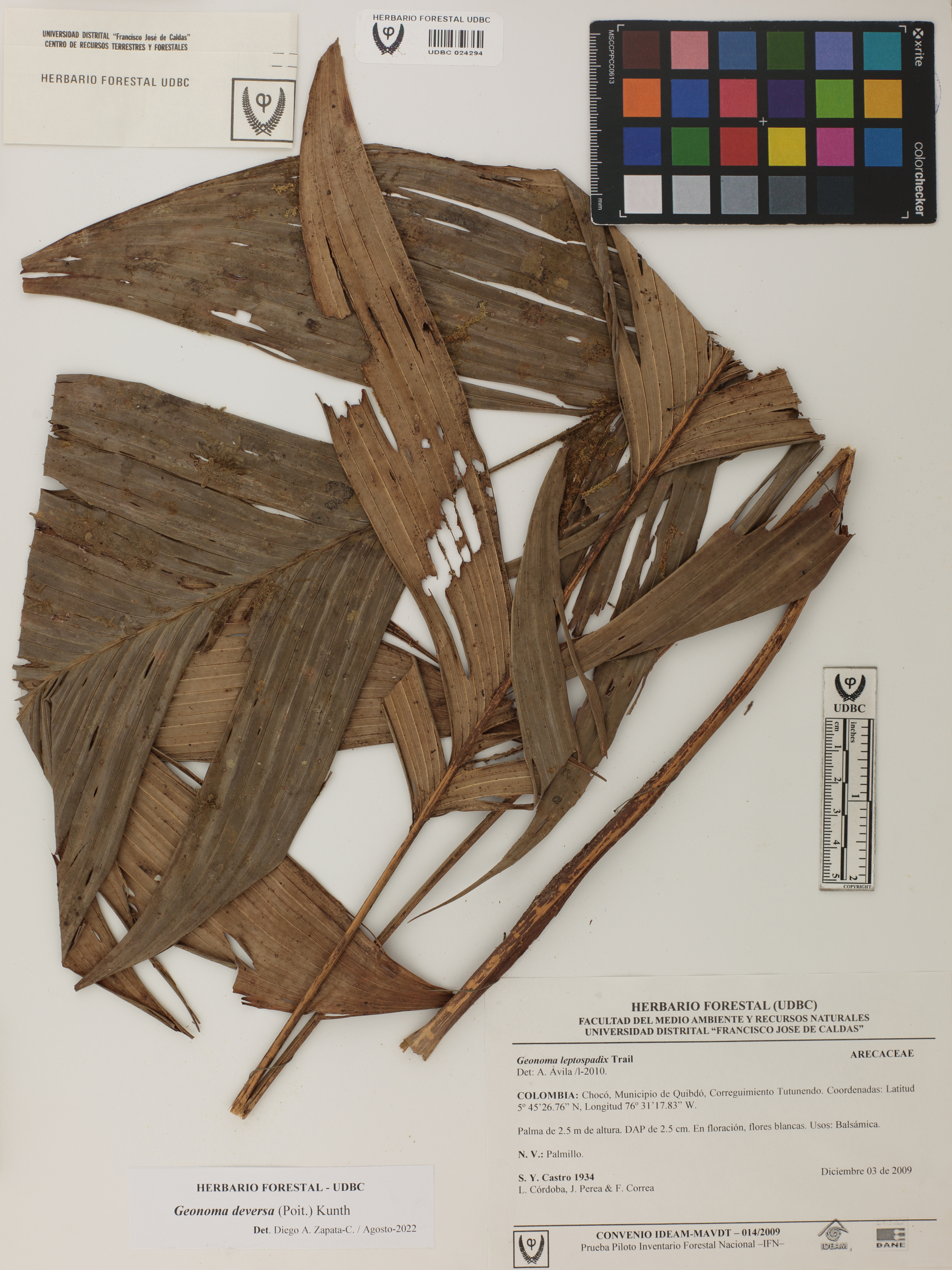 Fotografía del ejemplar Castro, S. 1934, determinado como Geonoma deversa en el año 2022