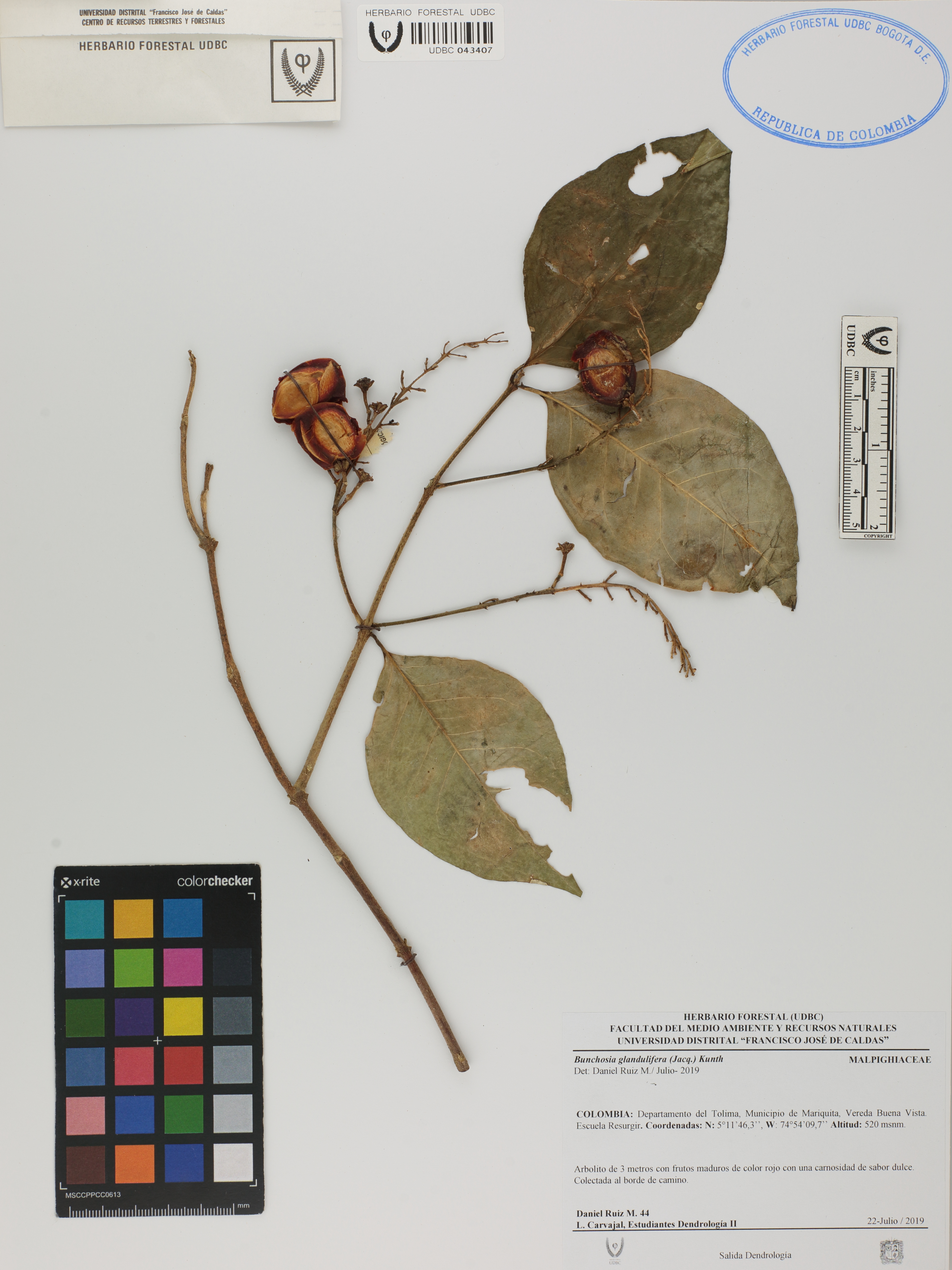 Fotografía del ejemplar Ruiz-M., D. 44, determinado como Bunchosia glandulifera en el año 2019
