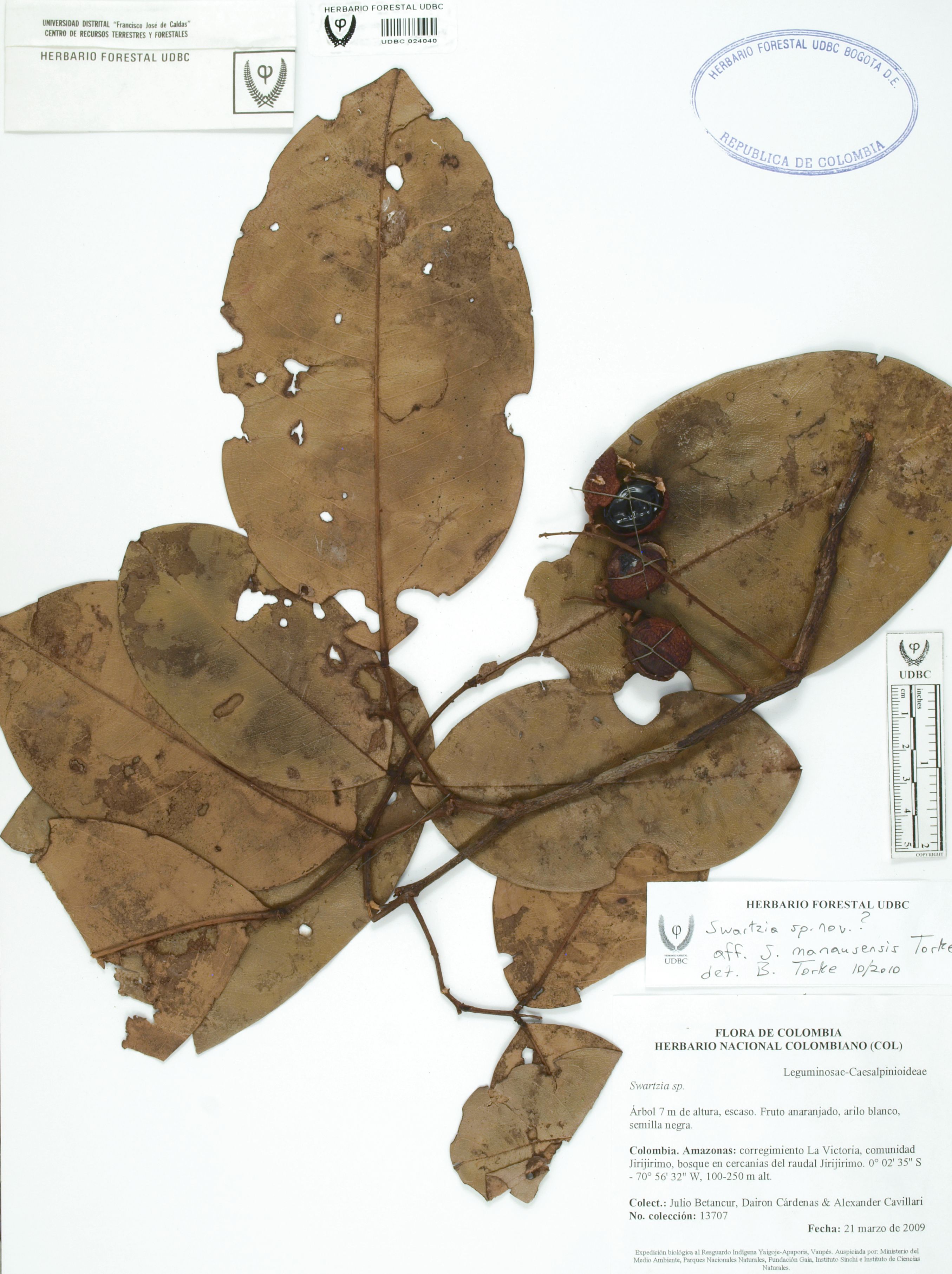 Fotografía del ejemplar Betancur, J. 13707, determinado como Swartzia manausensis en el año 2010