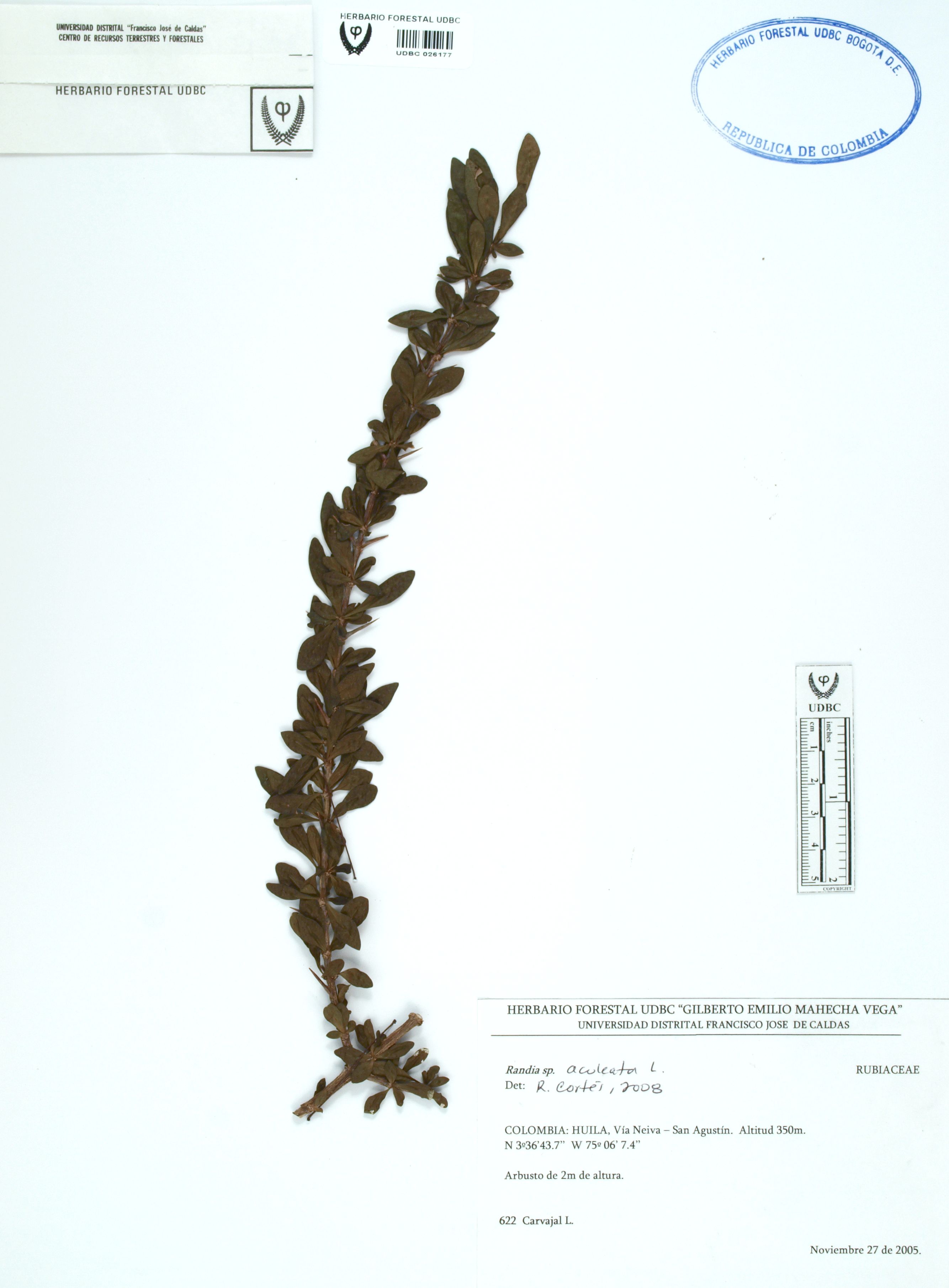 | dc.description | Fotografía del ejemplar Carvajal, L. 622, determinado como Randia aculeata en el año 2008 | |