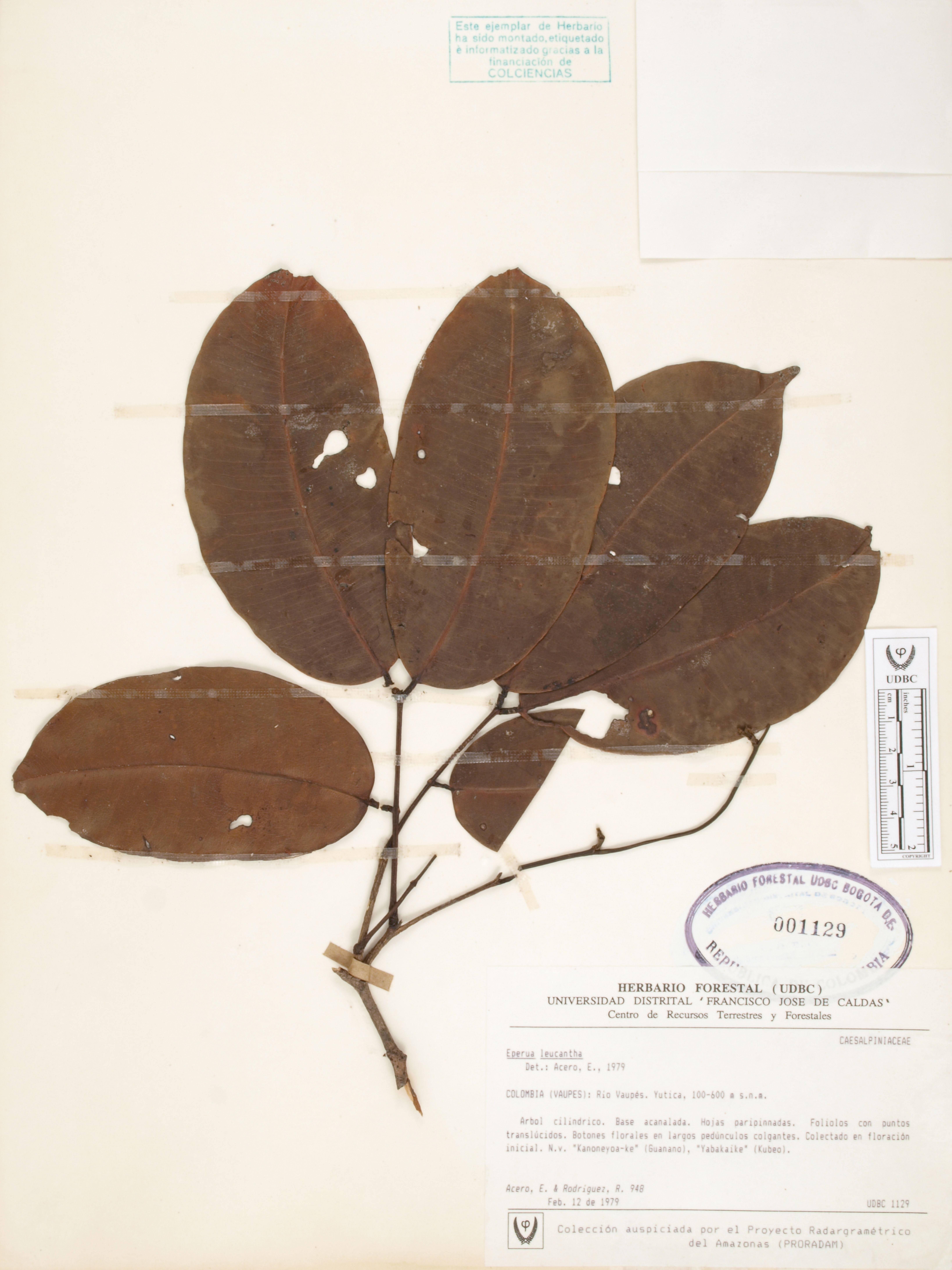 Fotografía del ejemplar Rodríguez, R. 948, determinado como Eperua leucantha en el año 1979