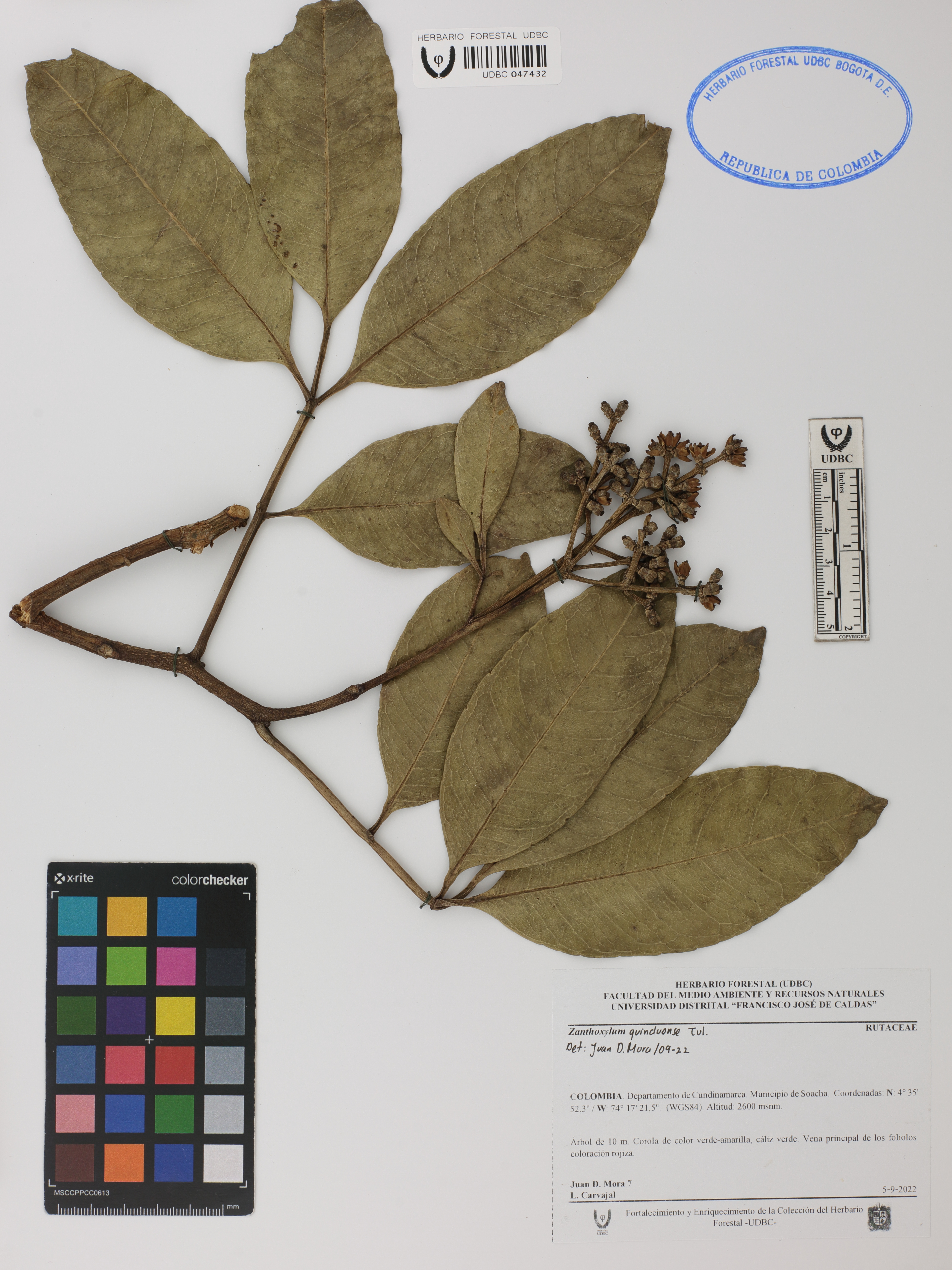 Fotografía del ejemplar Mora, J. 7, determinado como Zanthoxylum quinduense en el año 2022