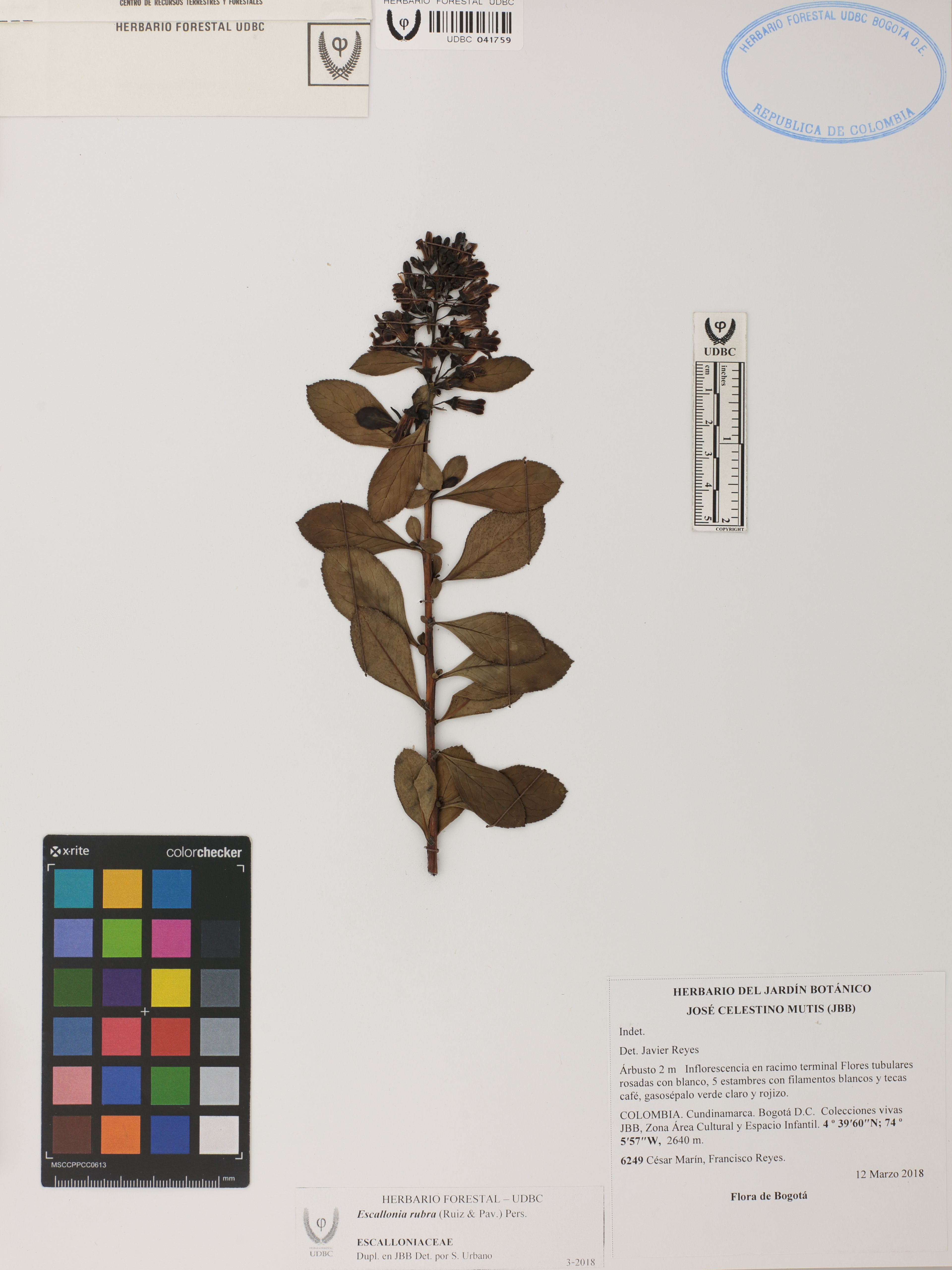 Fotografía del ejemplar Marín, C. 6249, determinado como Escallonia rubra en el año 2018