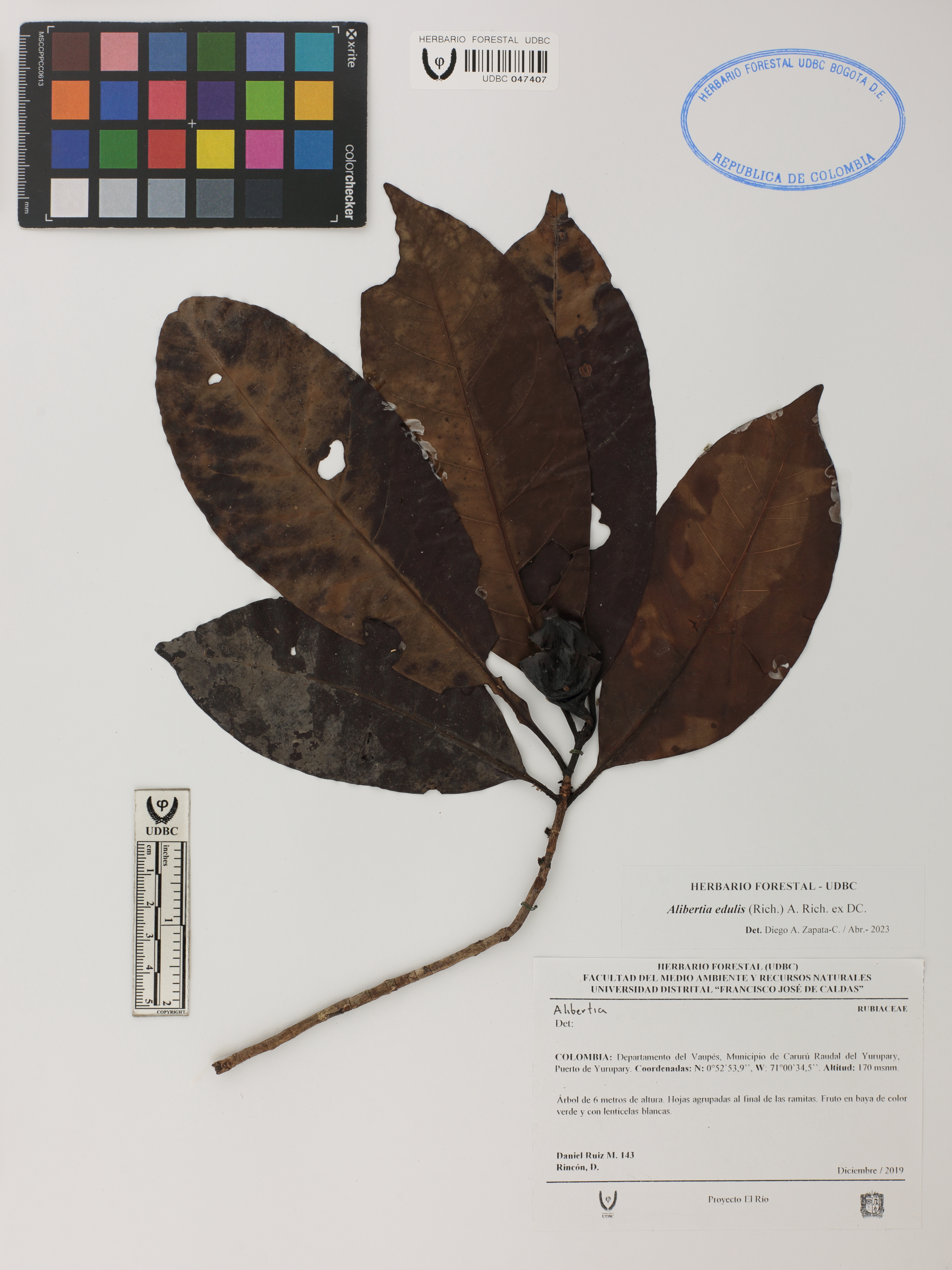 Fotografía del ejemplar Ruiz, D. 143, determinado como Alibertia edulis en el año 2023