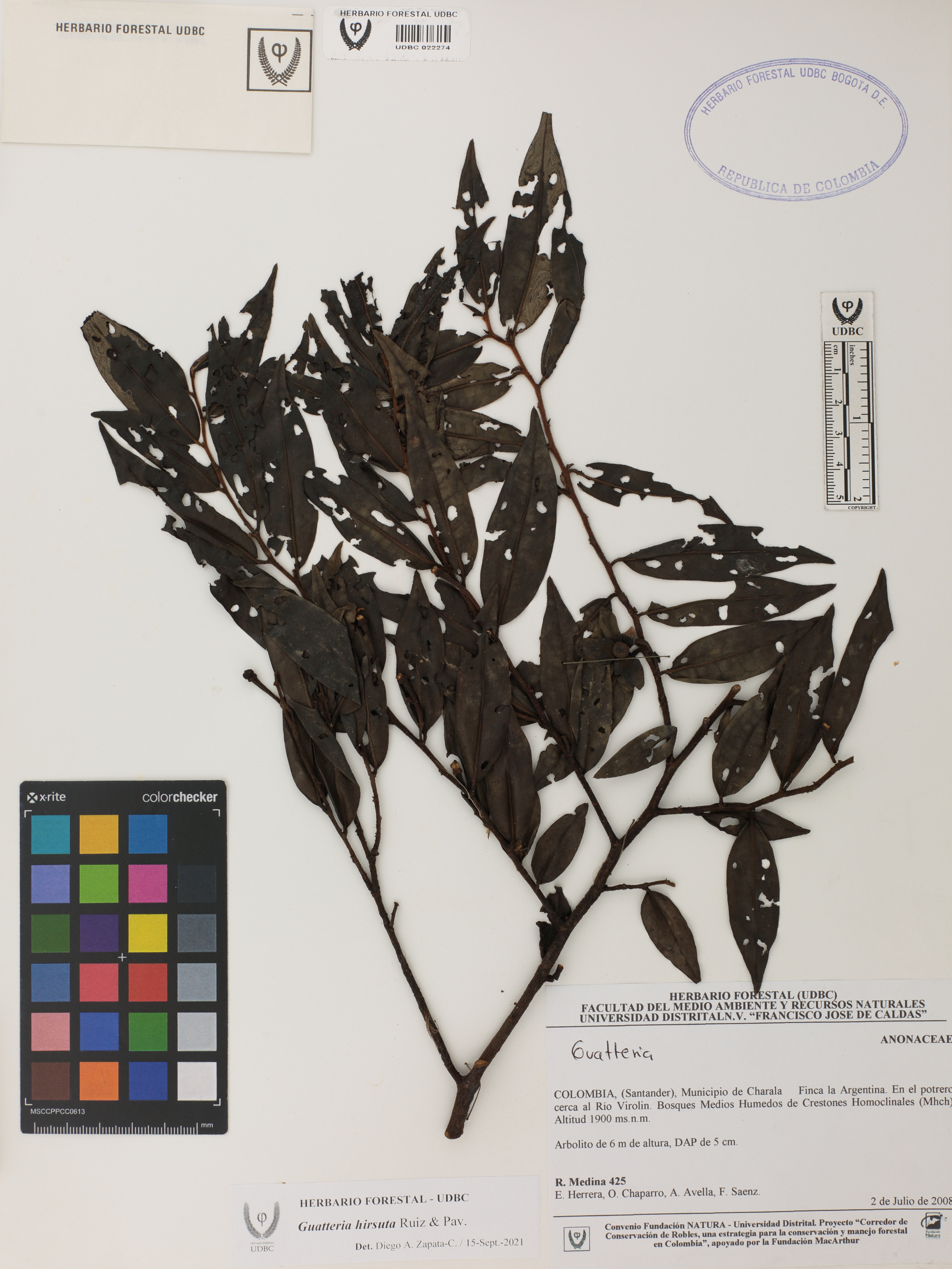 Fotografía del ejemplar Medina, R. 425, determinado como Guatteria hirsuta en el año 2021
