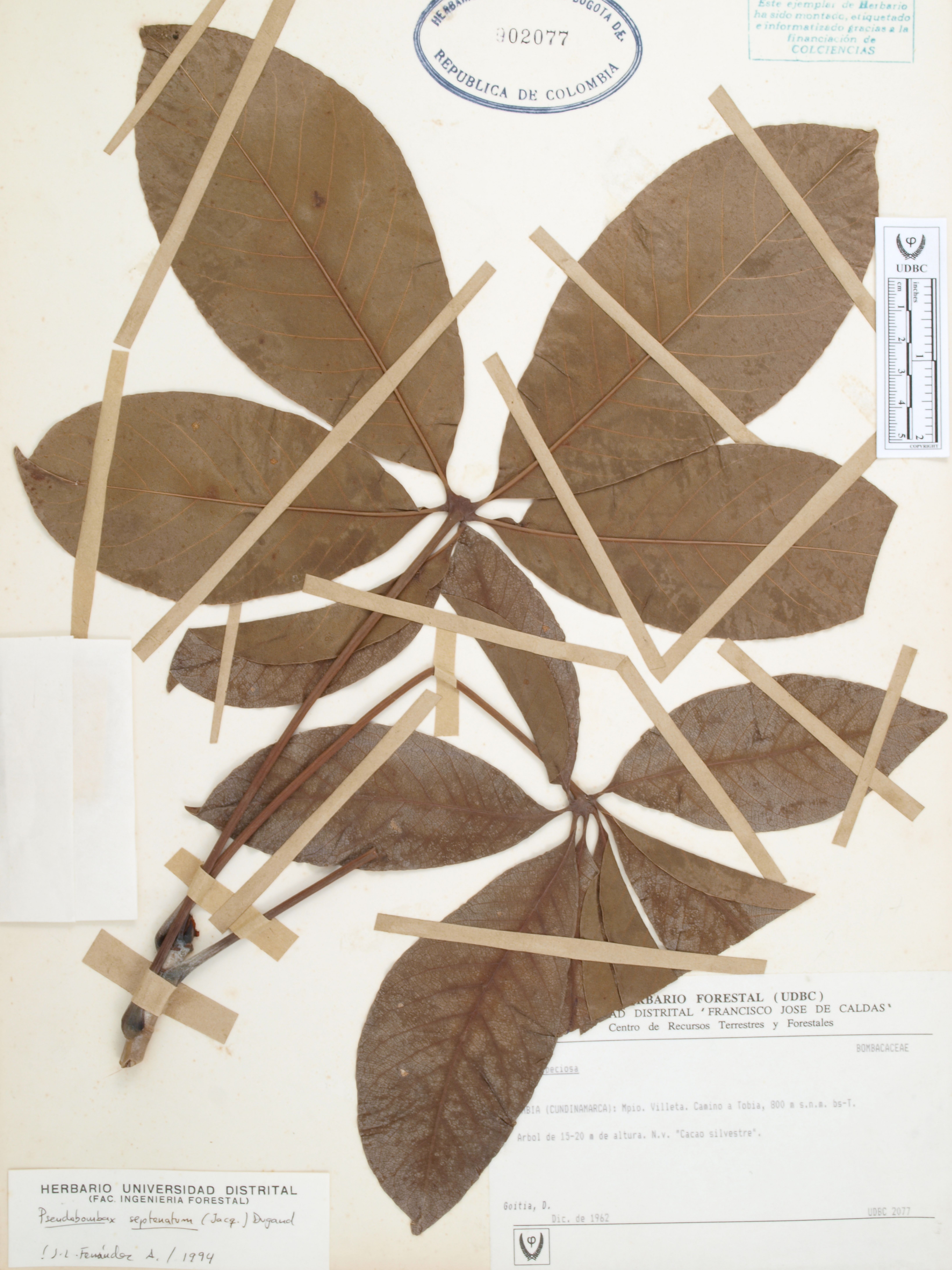 Fotografía del ejemplar Goitia, D., determinado como Pseudobombax septenatum en el año 1994