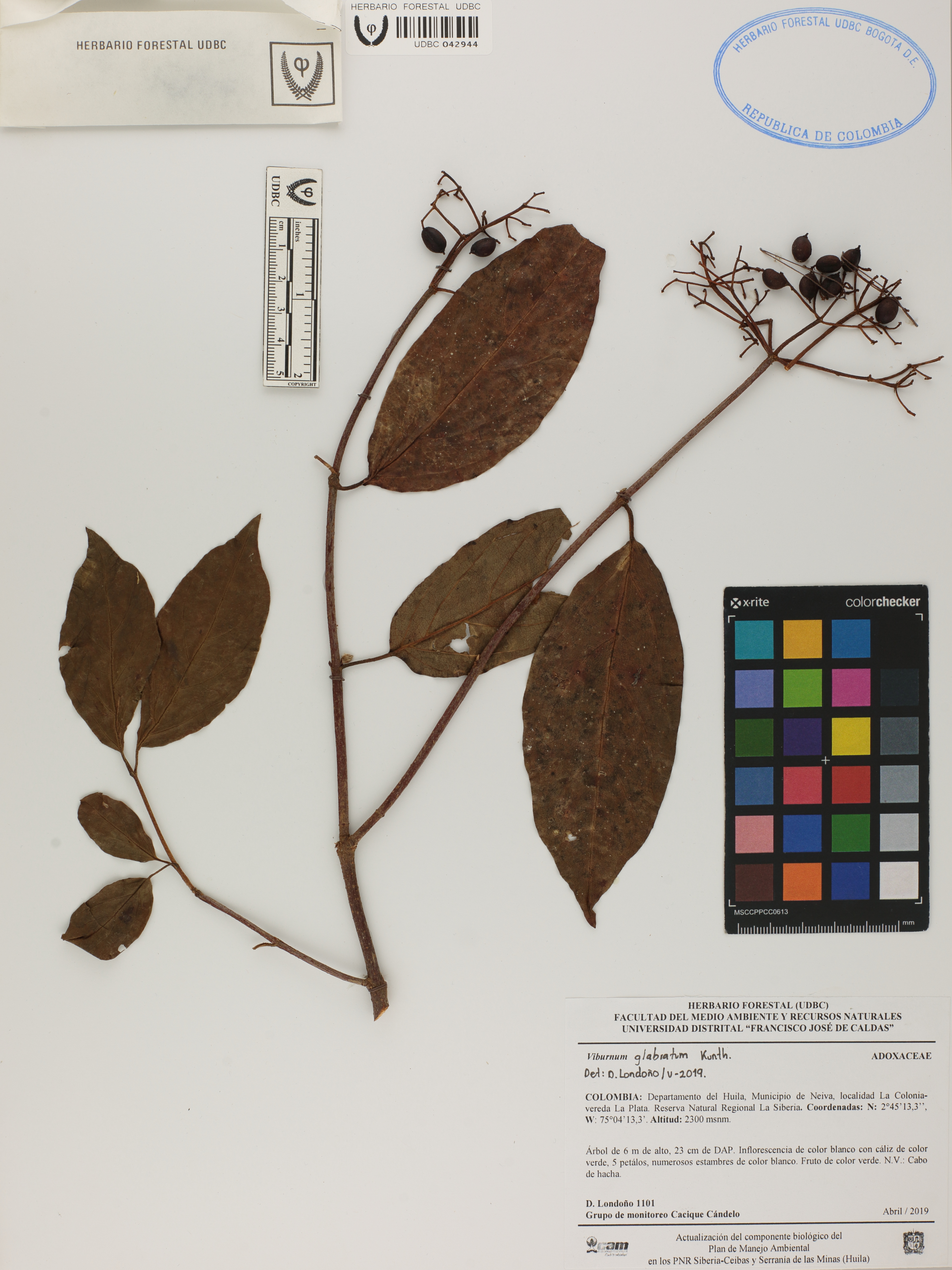 Fotografía del ejemplar Londoño, D. 1101, determinado como Viburnum glabratum en el año 2019