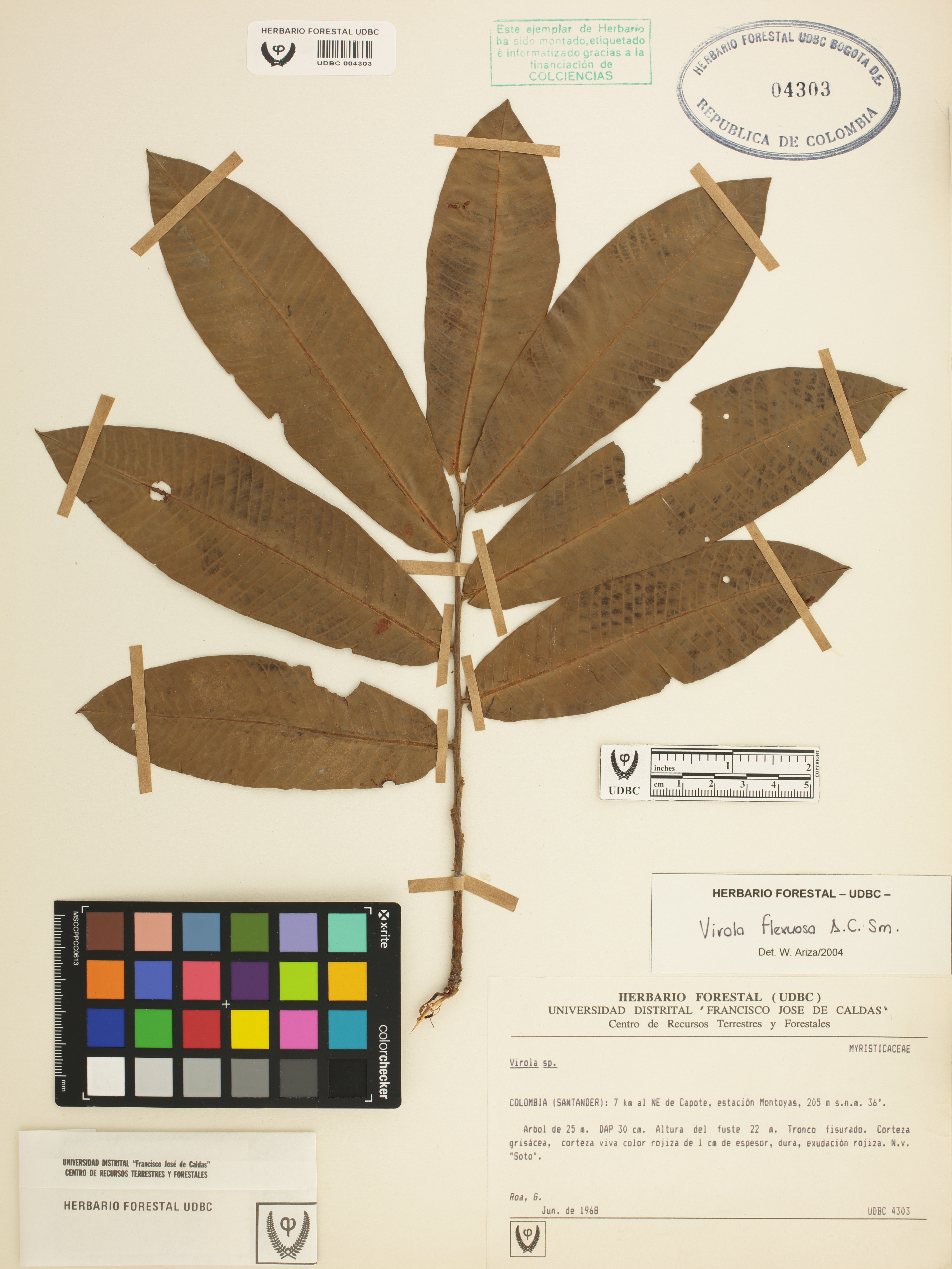 Fotografía del ejemplar Roa, G., determinado como Virola flexuosa en el año 2004