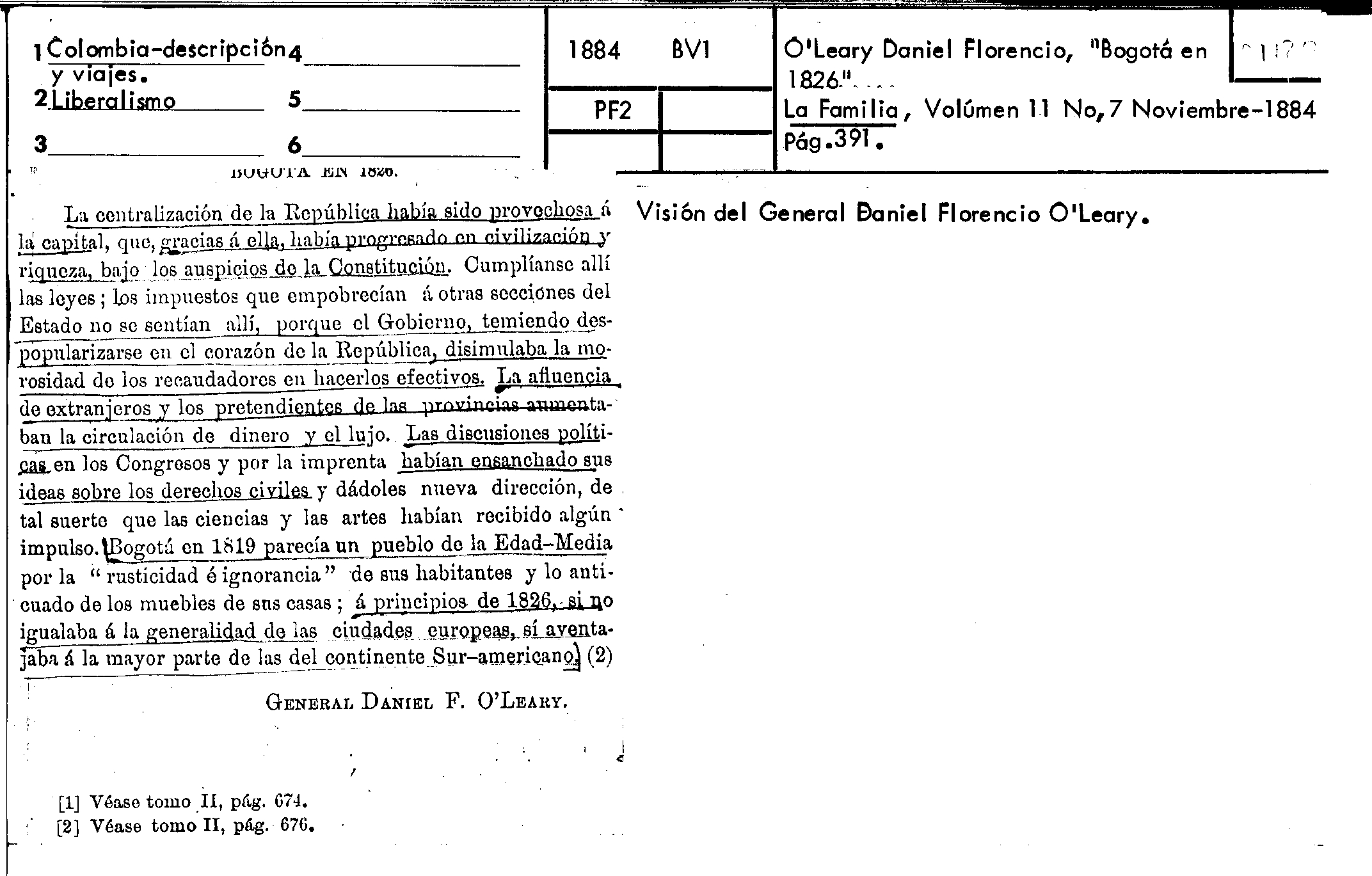 The image contains a news story about General Daniel Florencio O'Leary who observes a transformation in Bogotá during the process of centralization of the Republic in the 19th century. Previously, the city was considered backward and rustic, but with centralization, it experienced an increase in civilization and wealth. The laws were followed and taxes were applied more gently in the capital. The arrival of foreigners and seekers from the provinces contributed to the increase in the circulation of money and luxury. Political discussions and the press expanded the understanding of civil rights, which also boosted the sciences and arts in the city. Bogotá in 1826 showed signs of modernization and surpassed many other cities on the South American continent. News published in the newspaper La Familia, Volume 11, November 7, 1884.