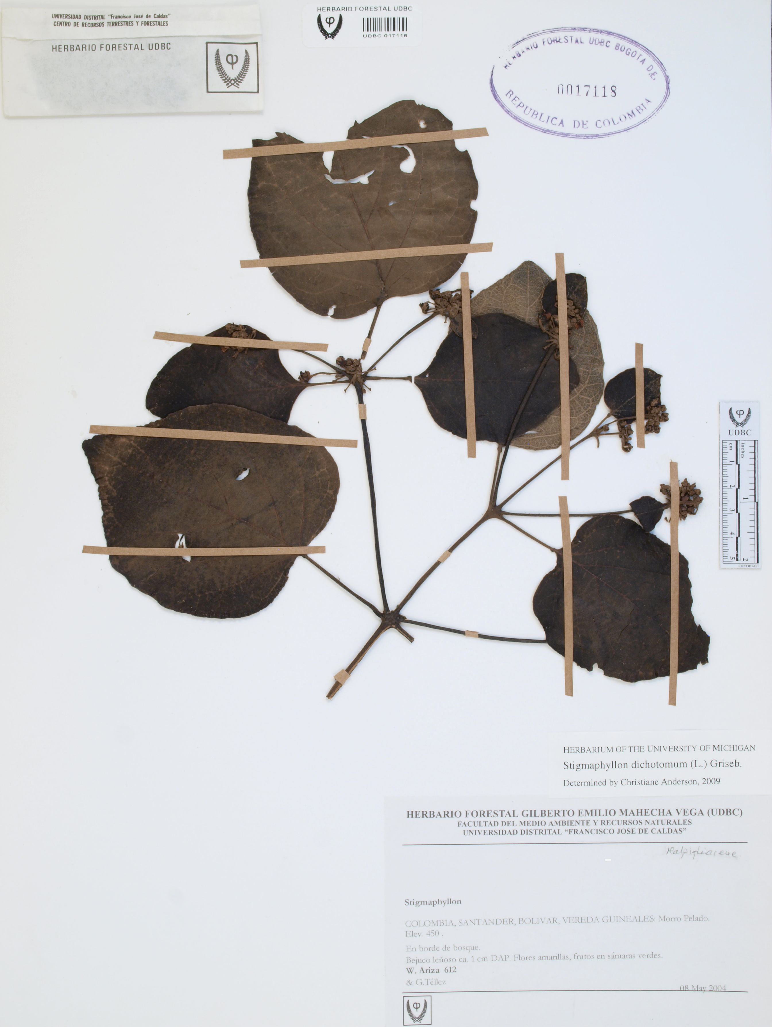 Fotografía del ejemplar Ariza, W. 612, determinado como Stigmaphyllon dichotomum en el año 2009