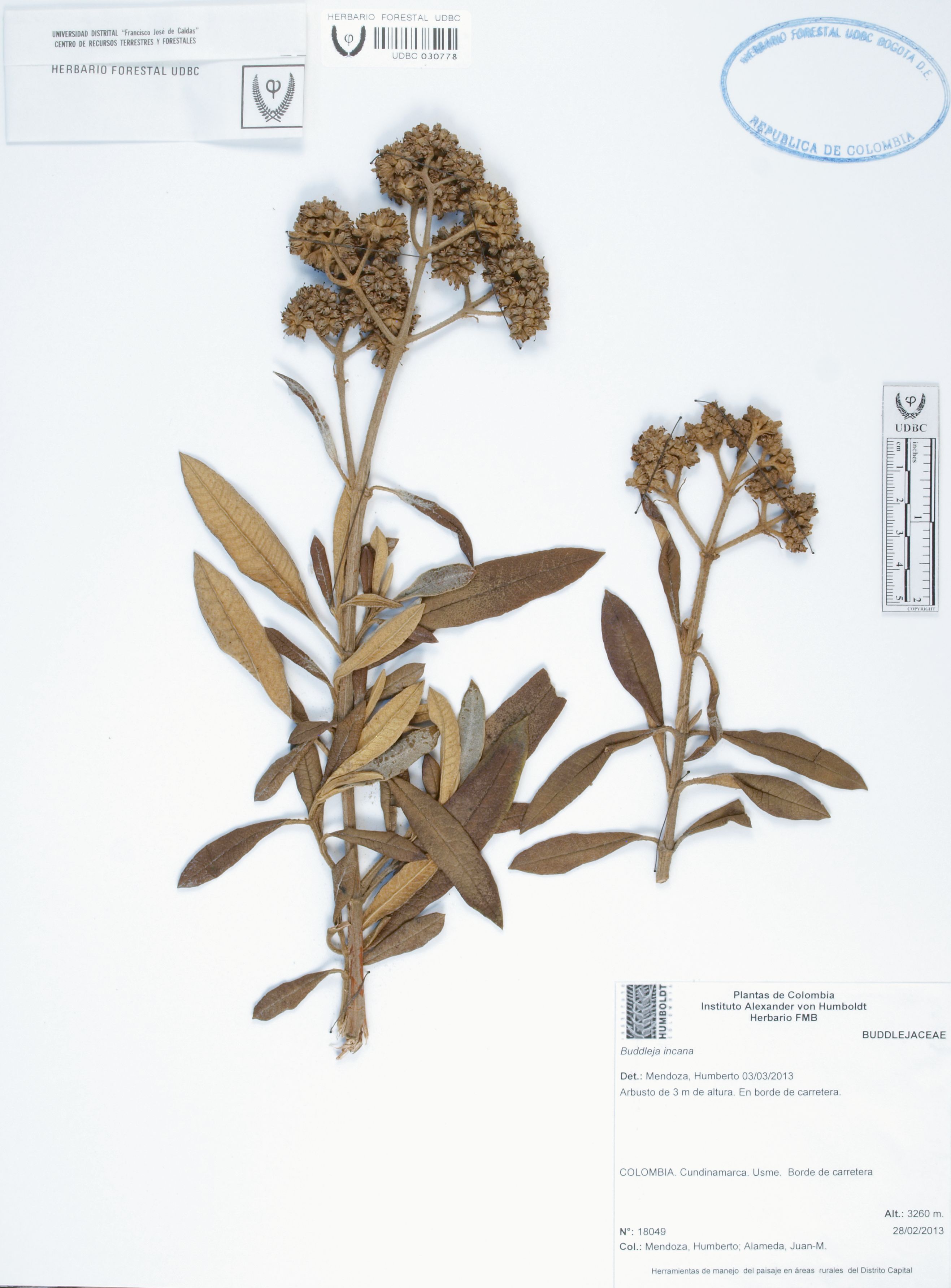 Fotografía del ejemplar Mendoza, H. 18049, determinado como Buddleja incana en el año 2013