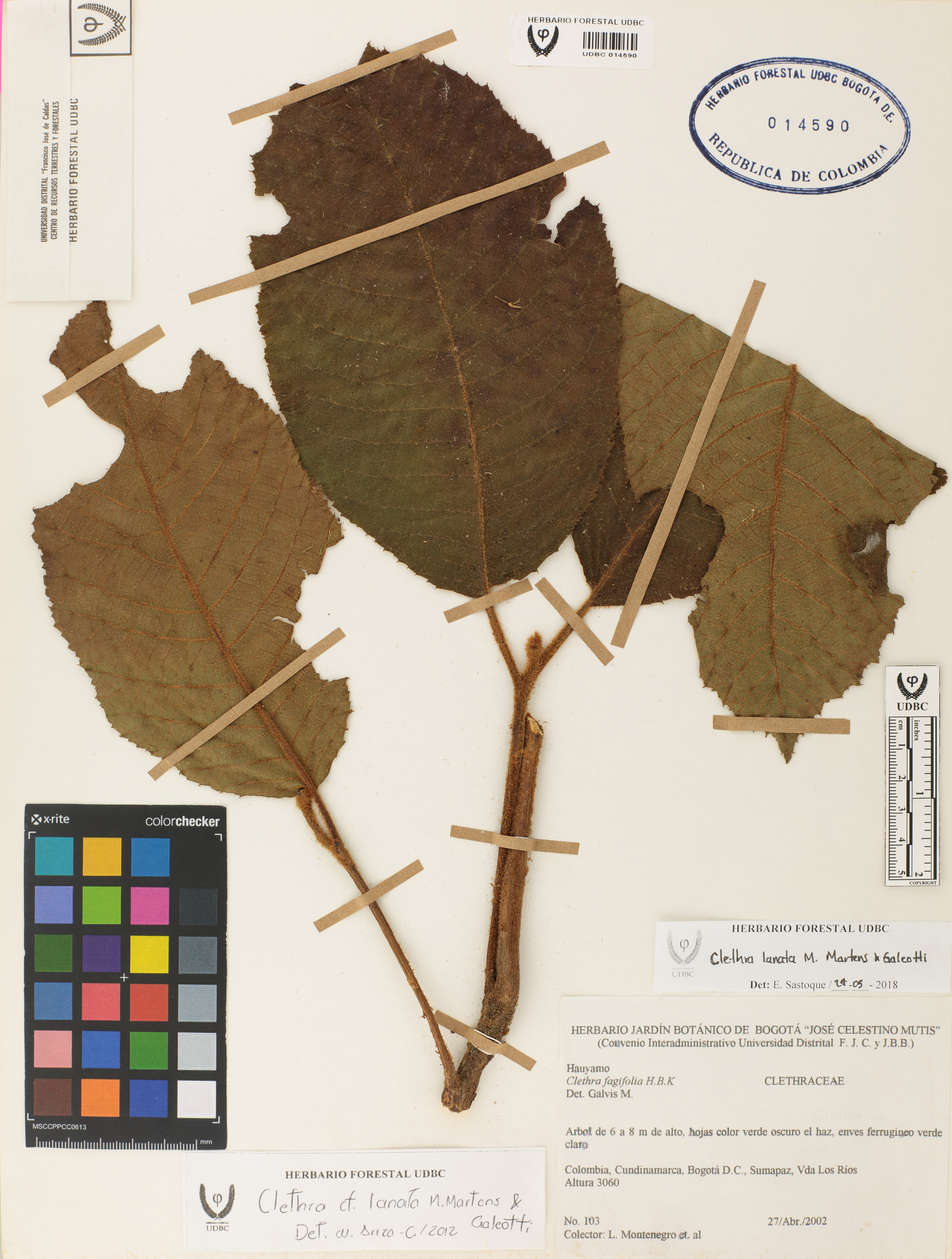 Fotografía del ejemplar Montenegro, L. 103, determinado como Clethra lanata en el año 2018