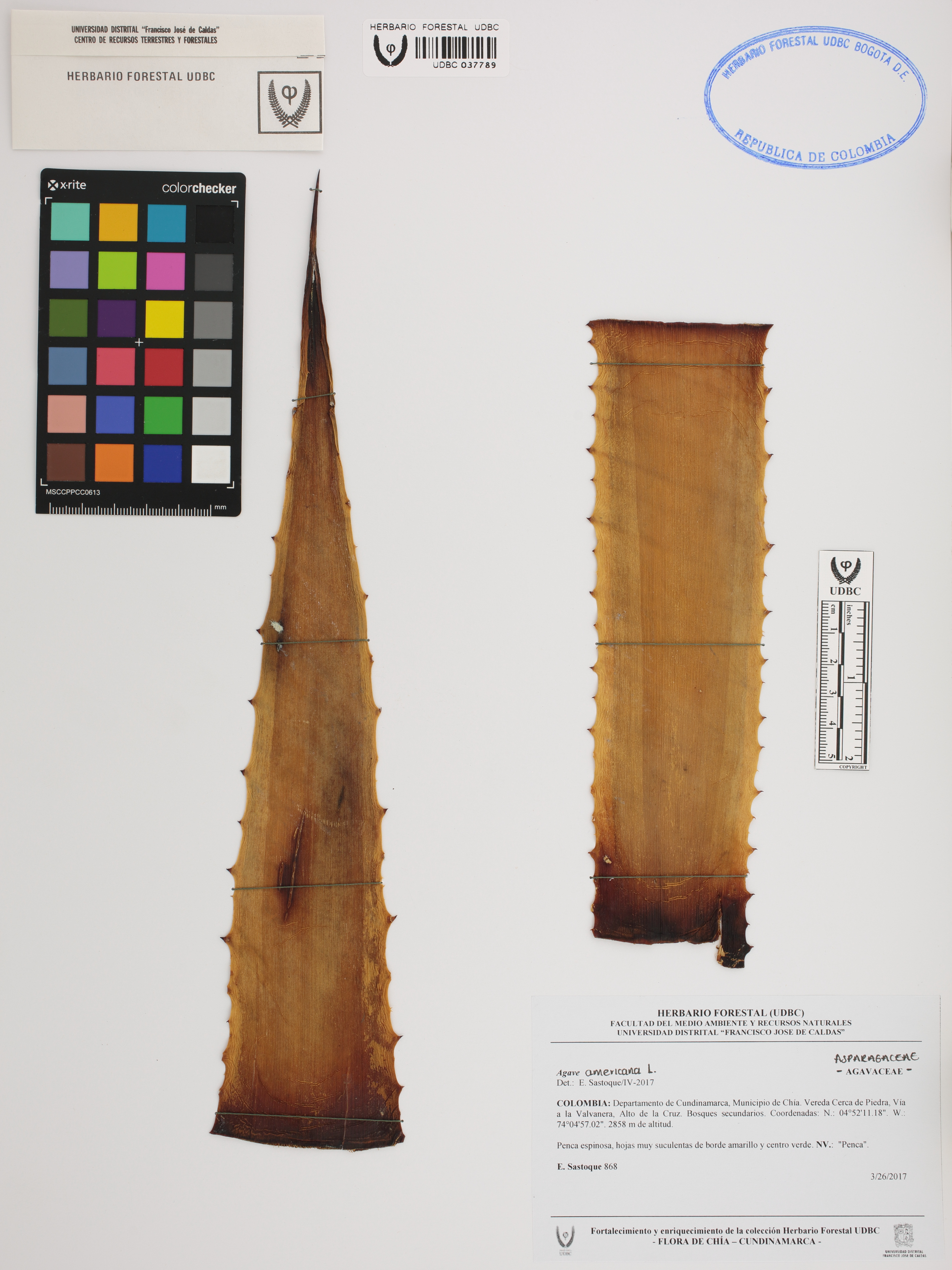 Fotografía del ejemplar Sastoque, E. 868, determinado como Agave americana en el año 2017