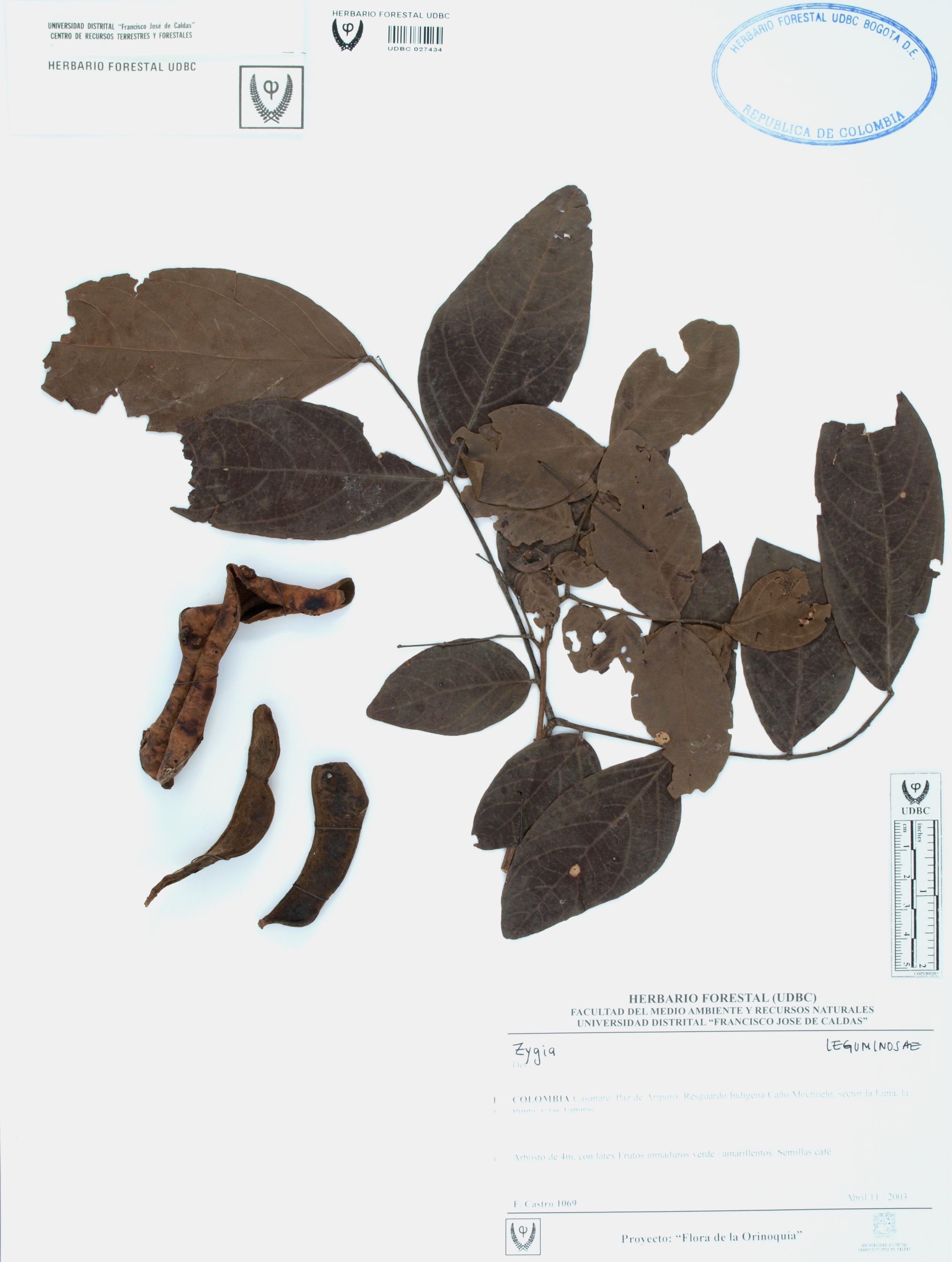 Fotografía del ejemplar Castro, F. 1069, determinado como Zygia latifolia en el año 2014