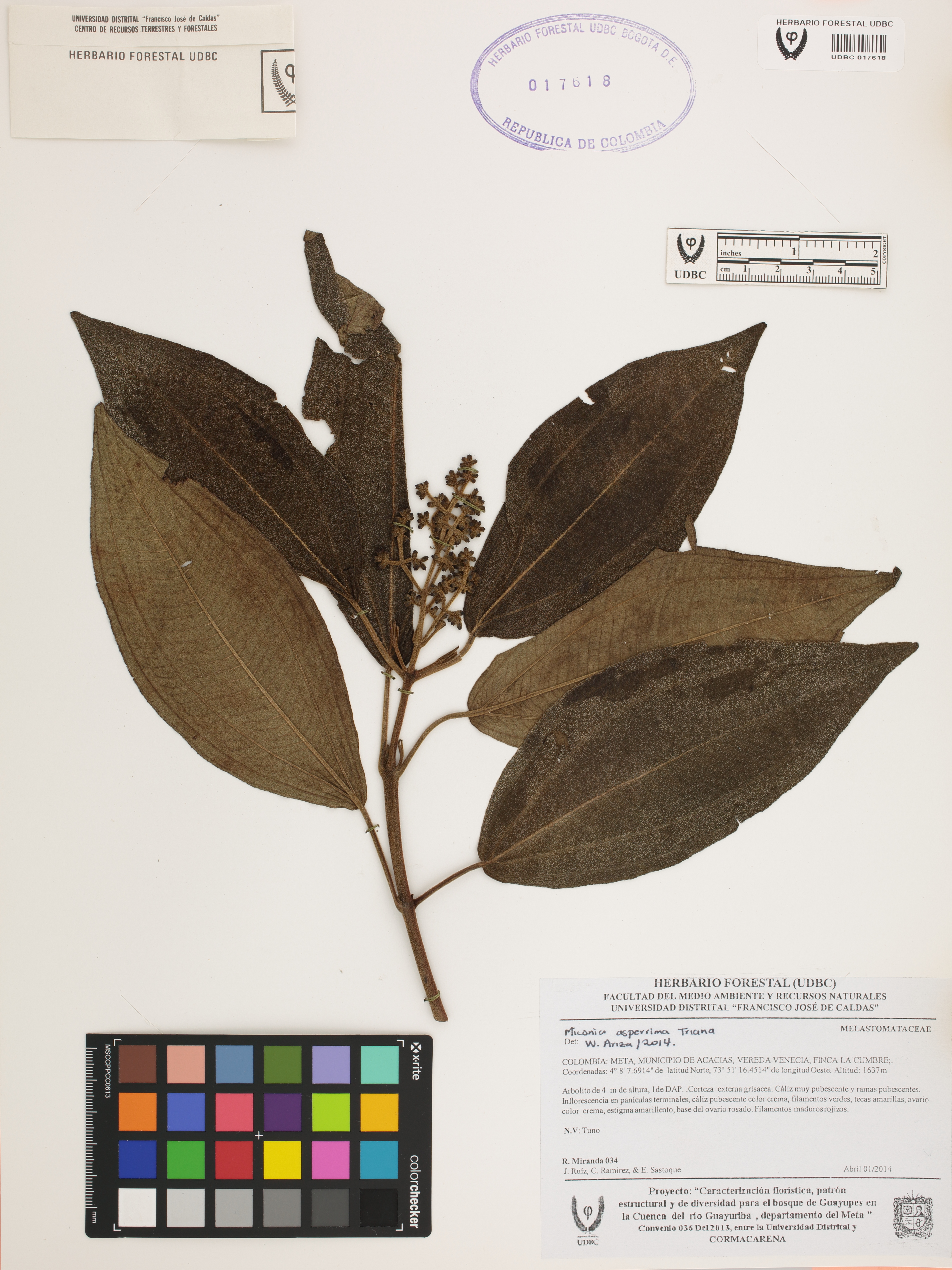 Fotografía del ejemplar Miranda, R. 34, determinado como Miconia asperrima en el año 2014